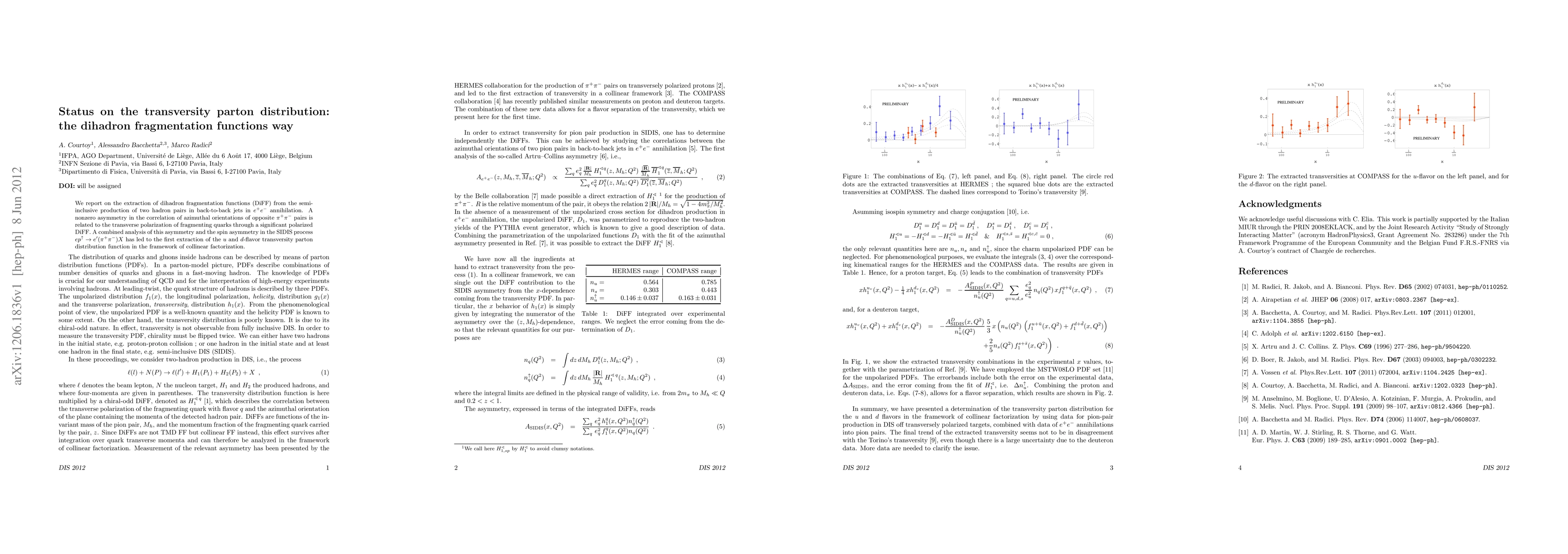 We report on the extraction of dihadron fragmentation functions (DiFF) from the semiinclusive production of two hadron pairs in back-to-back jets in e+e- annihilation. A nonzero asymmetry in the correlation of azimuthal orientations of opposite $\pi^+\pi^-$ pairs is related to the transverse polarization of fragmenting quarks through a significant polarized DiFF. A combined analysis of this asymmetry and the spin asymmetry in the SIDIS process $ep^{\uparrow}\to e'(\pi^+\pi^-)X$ has led to the first extraction of the u and d-flavor transversity parton distribution function in the framework of collinear factorization.
