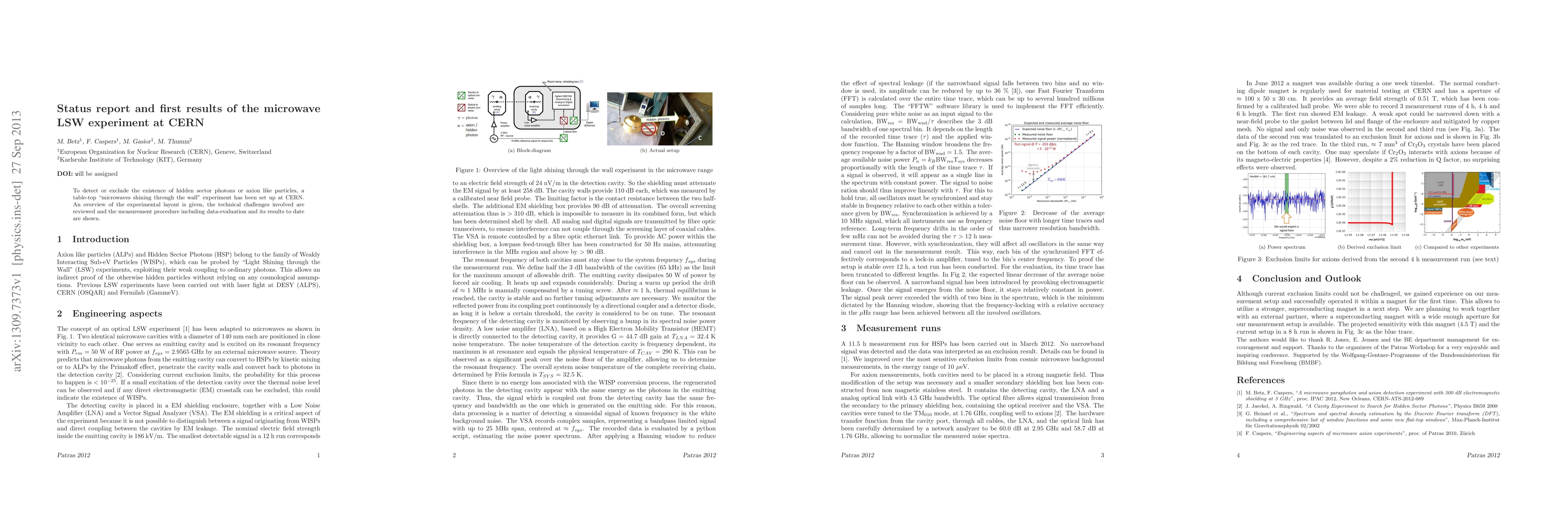 This paper provides an overview of the microwave LSW experiment at CERN designed to detect hidden sector photons or axion-like particles, detailing the experimental setup, technical challenges, and initial results from the measurement procedure. Preliminary findings and data evaluation are presented.