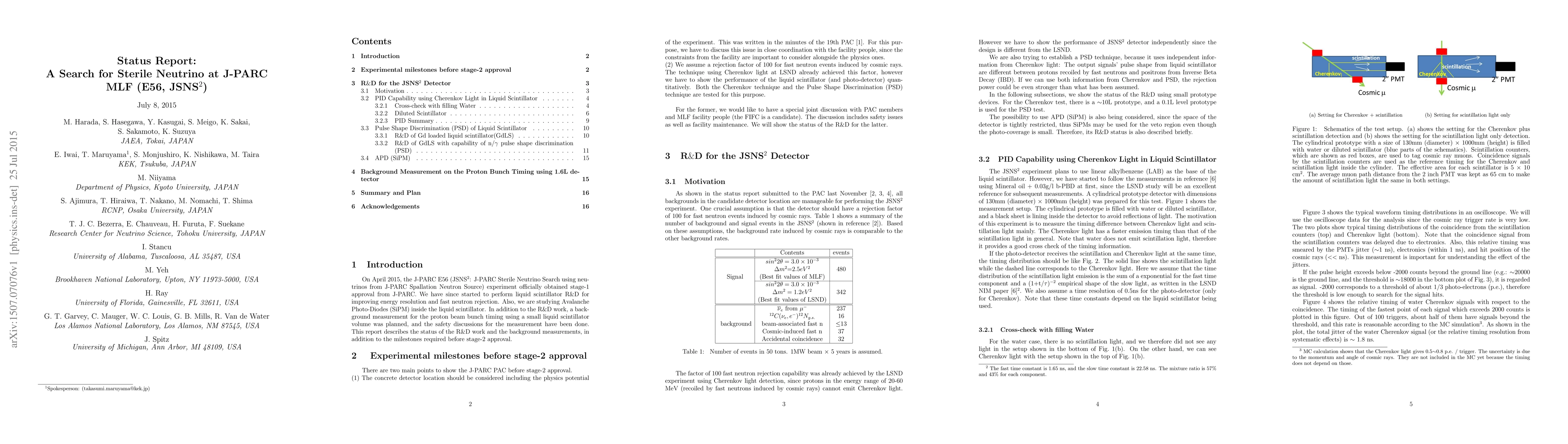 On April 2015, the J-PARC E56 (JSNS2: J-PARC Sterile Neutrino Search using neutrinos from J-PARC Spallation Neutron Source) experiment officially obtained stage-1 approval from J-PARC. We have since started to perform liquid scintillator R&D for improving energy resolution and fast neutron rejection. Also, we are studying Avalanche Photo-Diodes (SiPM) inside the liquid scintillator. In addition to the R&D work, a background measurement for the proton beam bunch timing using a small liquid scintillator volume was planned, and the safety discussions for the measurement have been done. This report describes the status of the R&D work and the background measurements, in addition to the milestones required before stage-2 approval.