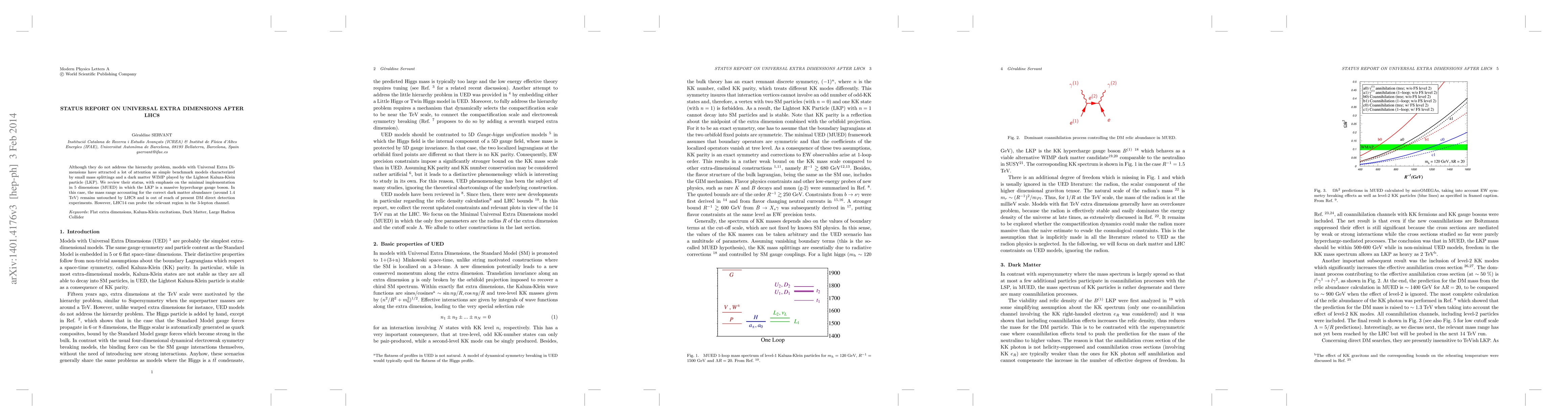 This paper reviews the status of Universal Extra Dimensions (UED) models, focusing on the minimal implementation in 5 dimensions (MUED). Despite no impact from LHC8, the mass range for the LKP dark matter candidate remains unexplored, with future LHC14 experiments potentially probing the relevant region via the 3-lepton channel.