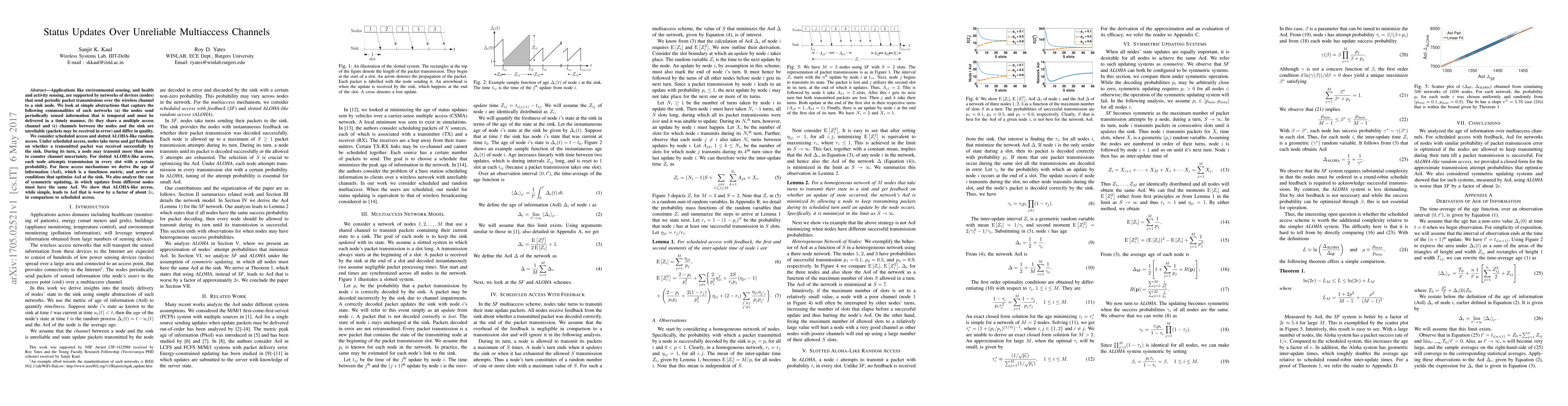 Applications like environmental sensing, and health and activity sensing, are supported by networks of devices (nodes) that send periodic packet transmissions over the wireless channel to a sink node. We look at simple abstractions that capture the following commonalities of such networks (a) the nodes send periodically sensed information that is temporal and must be delivered in a timely manner, (b) they share a multiple access channel and (c) channels between the nodes and the sink are unreliable (packets may be received in error) and differ in quality. We consider scheduled access and slotted ALOHA-like random access. Under scheduled access, nodes take turns and get feedback on whether a transmitted packet was received successfully by the sink. During its turn, a node may transmit more than once to counter channel uncertainty. For slotted ALOHA-like access, each node attempts transmission in every slot with a certain probability. For these access mechanisms we derive the age of information (AoI), which is a timeliness metric, and arrive at conditions that optimize AoI at the sink. We also analyze the case of symmetric updating, in which updates from different nodes must have the same AoI. We show that ALOHA-like access, while simple, leads to AoI that is worse by a factor of about 2e, in comparison to scheduled access.