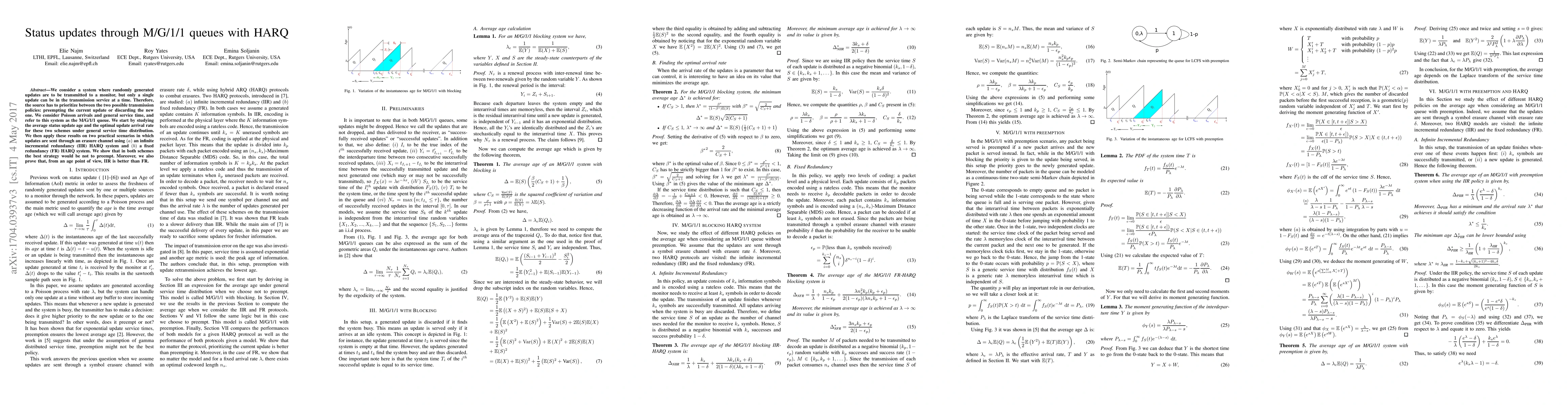 We consider a system where randomly generated updates are to be transmitted to a monitor, but only a single update can be in the transmission service at a time. Therefore, the source has to prioritize between the two possible transmission policies: preempting the current update or discarding the new one. We consider Poisson arrivals and general service time, and refer to this system as the M/G/1/1 queue. We start by studying the average status update age and the optimal update arrival rate for these two schemes under general service time distribution. We then apply these results on two practical scenarios in which updates are sent through an erasure channel using (a) an infinite incremental redundancy (IIR) HARQ system and (b) a fixed redundancy (FR) HARQ system. We show that in both schemes the best strategy would be not to preempt. Moreover, we also prove that, from an age point of view, IIR is better than FR.