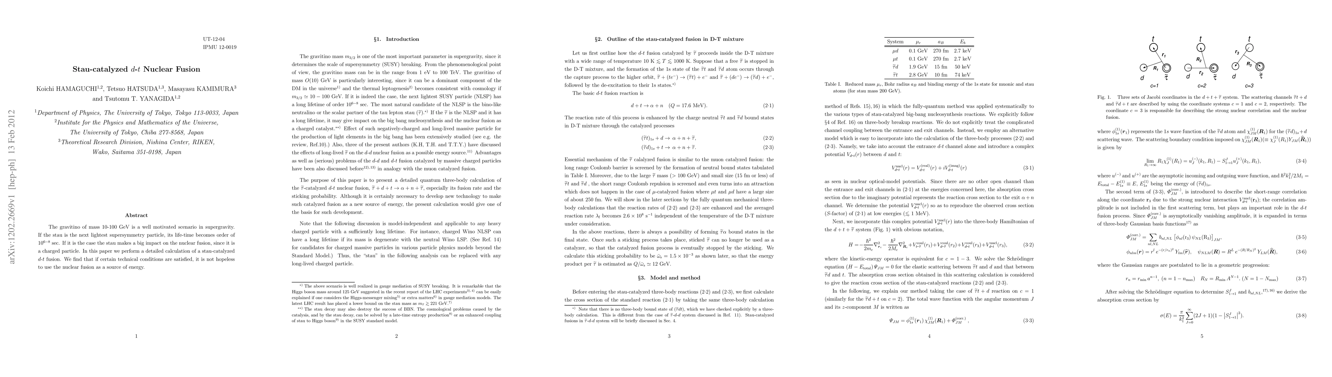 This paper investigates the potential of stau-catalyzed d-t nuclear fusion, finding that under specific technical conditions, it could serve as a viable energy source. The study focuses on the gravitino in supergravity and the long-lived stau, a charged particle that significantly influences nuclear fusion processes.