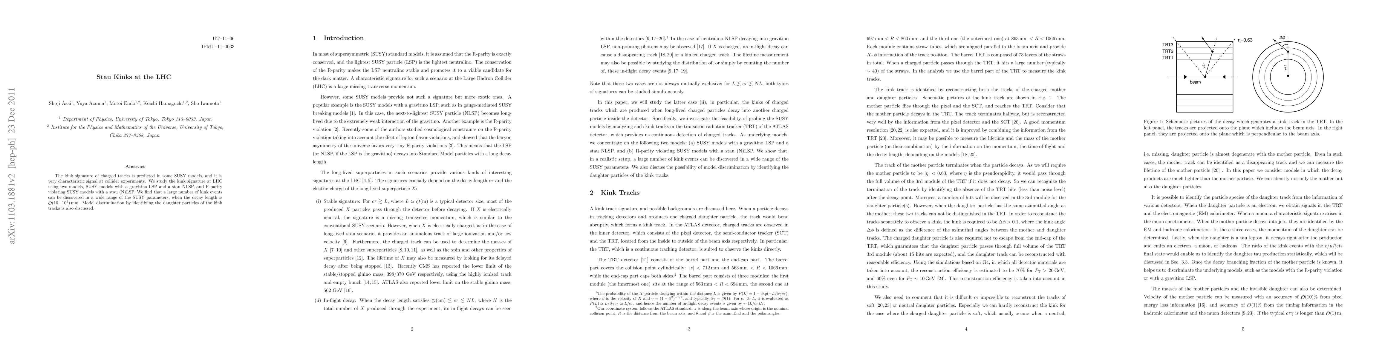 This paper investigates the kink signature in charged tracks predicted in certain SUSY models, focusing on the Large Hadron Collider (LHC). It finds a significant number of kink events in SUSY models with gravitino and stau, and R-parity violating models, particularly when the decay length is between 10-100,000 mm, and discusses methods for model discrimination via daughter particle identification.