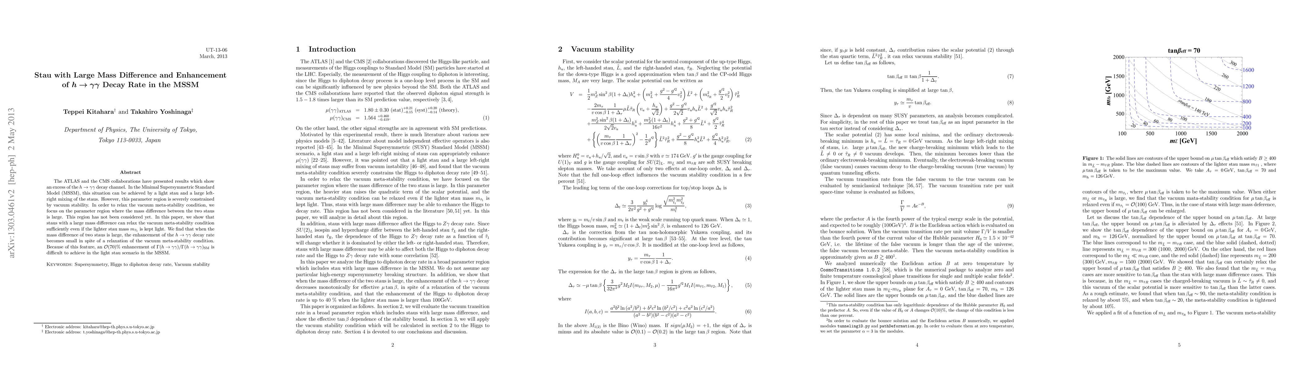 The ATLAS and the CMS collaborations have presented results which show an excess of the Higgs to diphoton decay channel. In the Minimal Supersymmetric Standard Model (MSSM), this situation can be achieved by a light stau and a large left-right mixing of the staus. However, this parameter region is severely constrained by vacuum stability. In order to relax the vacuum meta-stability condition, we focus on the parameter region where the mass difference between the two staus is large. This region has not been considered yet. In this paper, we show that staus with a large mass difference can relax the vacuum meta-stability condition sufficiently even if the lighter stau mass is kept light. We find that when the mass difference of two staus is large, the enhancement of the Higgs to diphoton decay rate becomes small in spite of a relaxation of the vacuum meta-stability condition. Because of this feature, an O(70)% enhancement of the Higgs to diphoton decay rate is difficult to achieve in the light stau scenario in the MSSM.