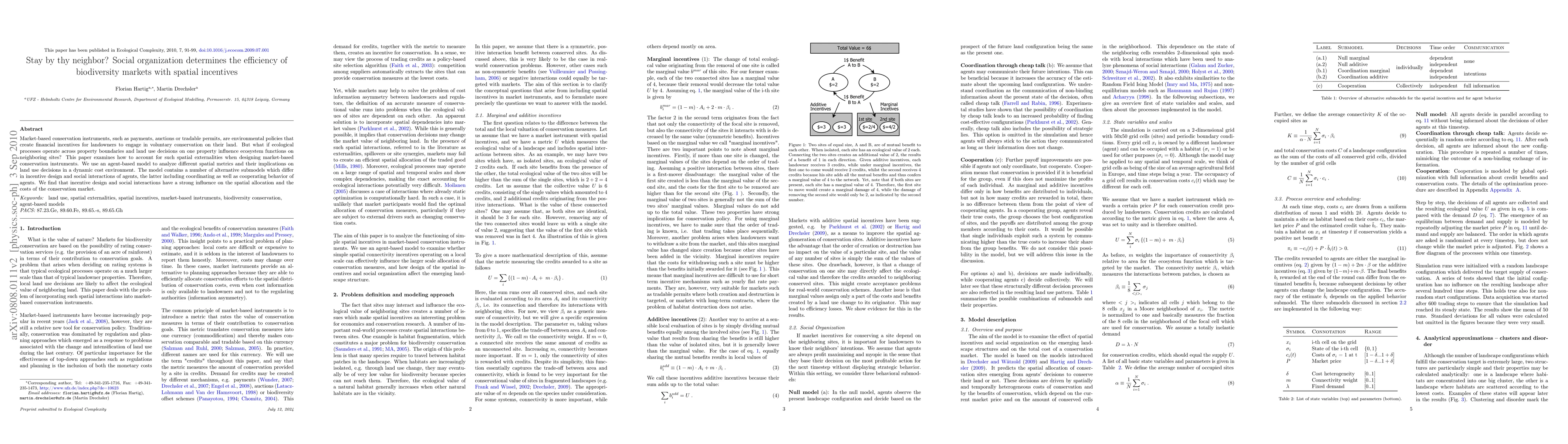 This paper explores how social organization and spatial incentives affect the efficiency of biodiversity markets. Using an agent-based model, it finds that incentive design and social interactions significantly influence land use decisions and the spatial allocation of conservation efforts, highlighting the importance of considering spatial externalities in market-based conservation instruments.