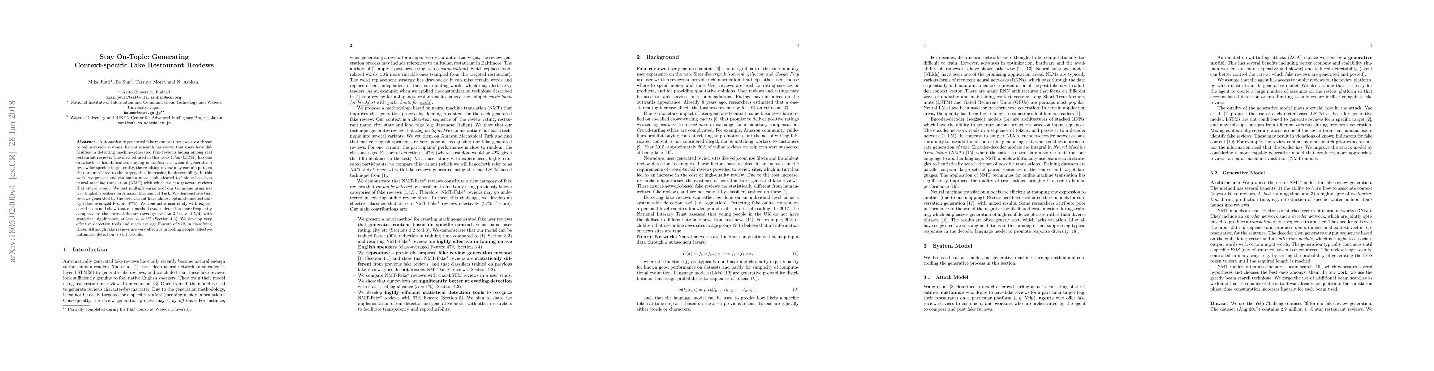 This paper proposes a neural machine translation (NMT) technique to generate context-specific fake restaurant reviews that remain on-topic, improving undetectability compared to previous methods. The study shows that the best variant achieves a class-averaged F-score of 47% and evades detection more effectively than the state-of-the-art, while also developing detection tools with an average F-score of 97%.