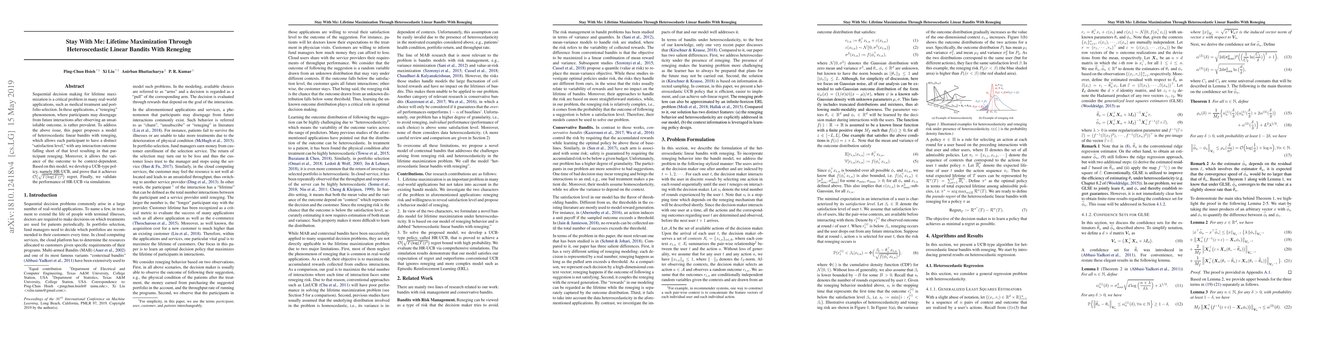 Sequential decision making for lifetime maximization is a critical problem in many real-world applications, such as medical treatment and portfolio selection. In these applications, a "reneging" phenomenon, where participants may disengage from future interactions after observing an unsatisfiable outcome, is rather prevalent. To address the above issue, this paper proposes a model of heteroscedastic linear bandits with reneging, which allows each participant to have a distinct "satisfaction level," with any interaction outcome falling short of that level resulting in that participant reneging. Moreover, it allows the variance of the outcome to be context-dependent. Based on this model, we develop a UCB-type policy, namely HR-UCB, and prove that it achieves $\mathcal{O}\big(\sqrt{{T}(\log({T}))^{3}}\big)$ regret. Finally, we validate the performance of HR-UCB via simulations.