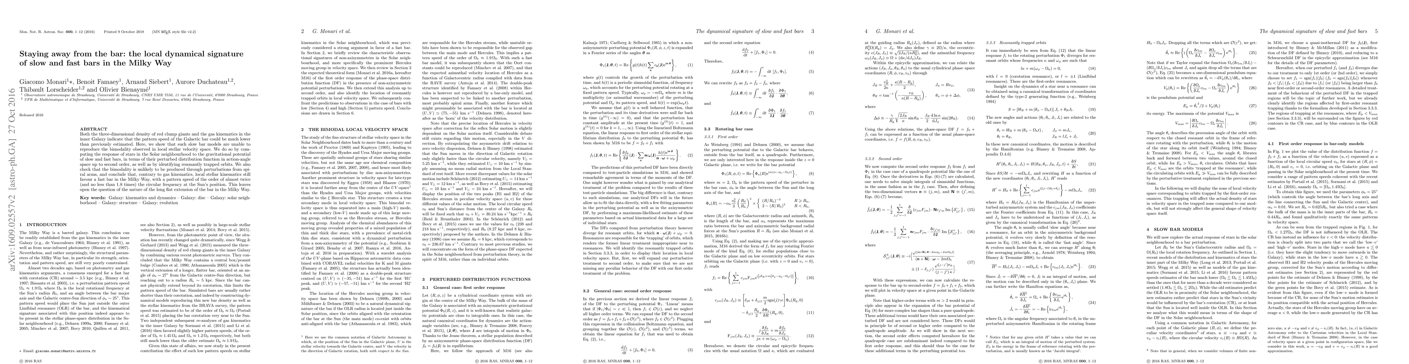 This paper investigates the dynamical signature of slow versus fast bars in the Milky Way using local stellar kinematics and finds that local stellar velocity distributions favor a fast bar with a pattern speed nearly twice the circular frequency at the Sun's position, despite slower bars suggested by gas kinematics. The study concludes that the bimodality in local stellar velocity space cannot be explained by slow bar models or spiral arm perturbations.