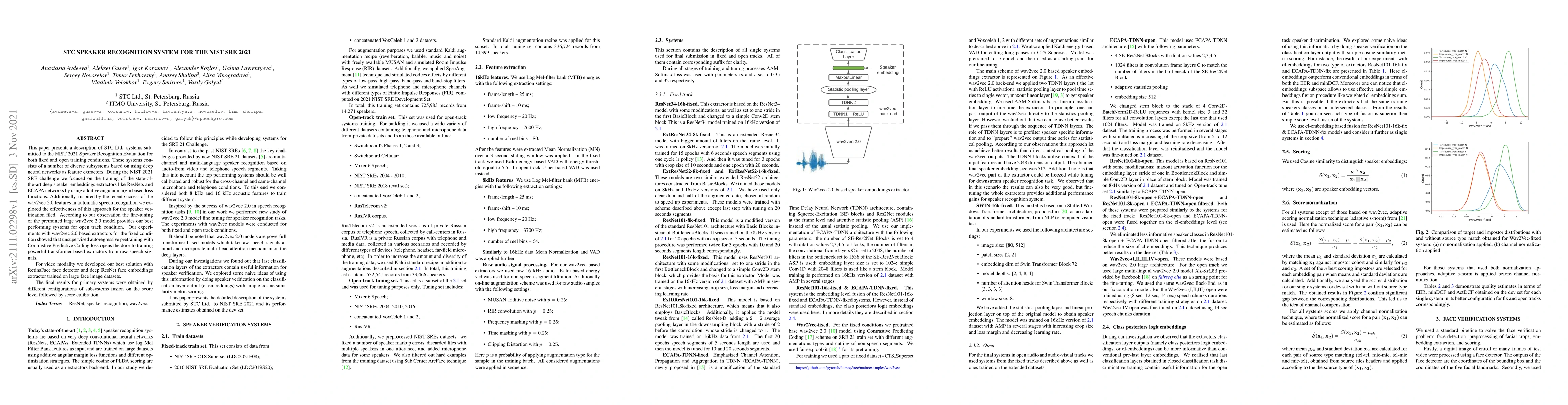This paper presents a description of STC Ltd. systems submitted to the NIST 2021 Speaker Recognition Evaluation for both fixed and open training conditions. These systems consists of a number of diverse subsystems based on using deep neural networks as feature extractors. During the NIST 2021 SRE challenge we focused on the training of the state-of-the-art deep speaker embeddings extractors like ResNets and ECAPA networks by using additive angular margin based loss functions. Additionally, inspired by the recent success of the wav2vec 2.0 features in automatic speech recognition we explored the effectiveness of this approach for the speaker verification filed. According to our observation the fine-tuning of the pretrained large wav2vec 2.0 model provides our best performing systems for open track condition. Our experiments with wav2vec 2.0 based extractors for the fixed condition showed that unsupervised autoregressive pretraining with Contrastive Predictive Coding loss opens the door to training powerful transformer-based extractors from raw speech signals. For video modality we developed our best solution with RetinaFace face detector and deep ResNet face embeddings extractor trained on large face image datasets. The final results for primary systems were obtained by different configurations of subsystems fusion on the score level followed by score calibration.