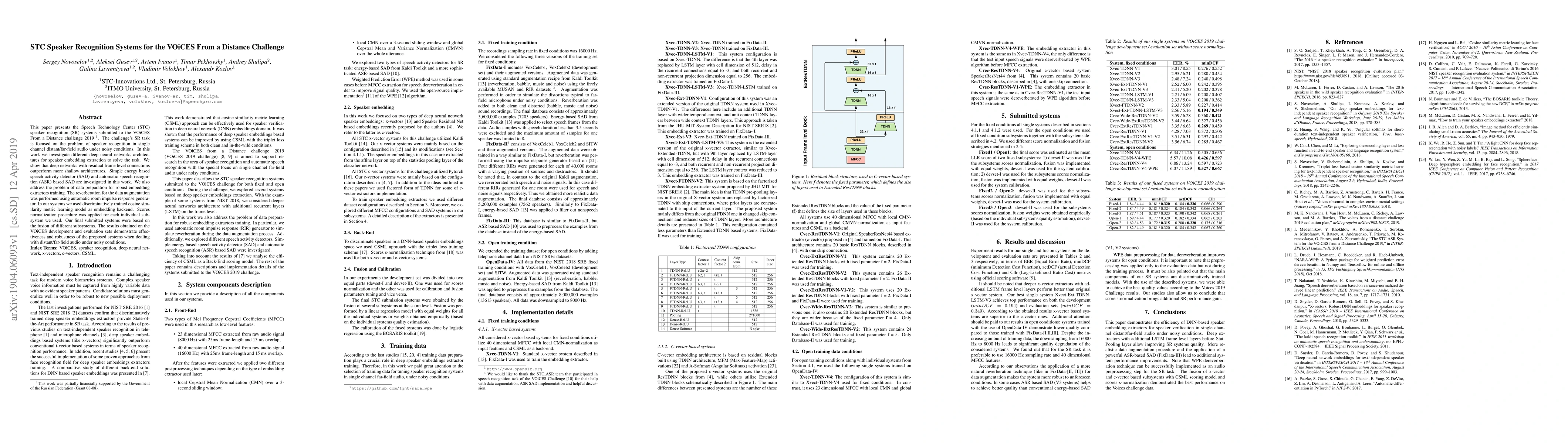 This paper presents the Speech Technology Center (STC) speaker recognition (SR) systems submitted to the VOiCES From a Distance challenge 2019. The challenge's SR task is focused on the problem of speaker recognition in single channel distant/far-field audio under noisy conditions. In this work we investigate different deep neural networks architectures for speaker embedding extraction to solve the task. We show that deep networks with residual frame level connections outperform more shallow architectures. Simple energy based speech activity detector (SAD) and automatic speech recognition (ASR) based SAD are investigated in this work. We also address the problem of data preparation for robust embedding extractors training. The reverberation for the data augmentation was performed using automatic room impulse response generator. In our systems we used discriminatively trained cosine similarity metric learning model as embedding backend. Scores normalization procedure was applied for each individual subsystem we used. Our final submitted systems were based on the fusion of different subsystems. The results obtained on the VOiCES development and evaluation sets demonstrate effectiveness and robustness of the proposed systems when dealing with distant/far-field audio under noisy conditions.