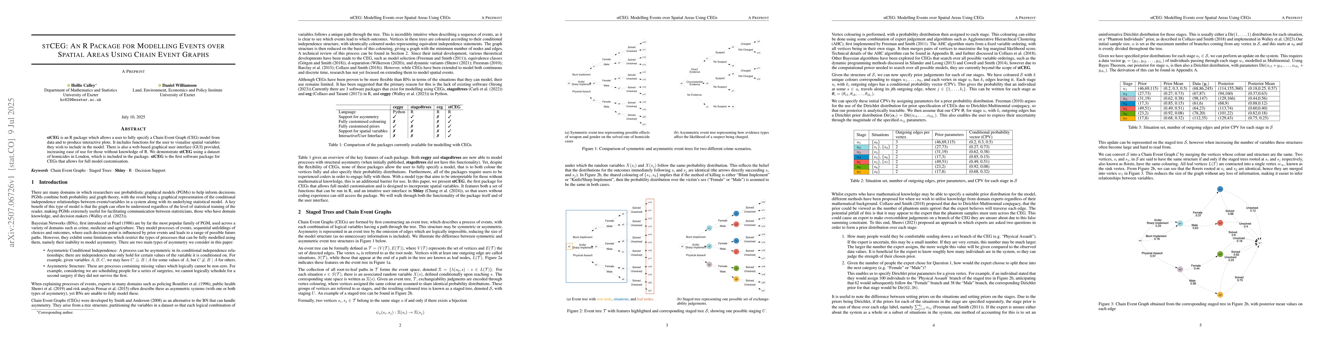 stCEG is an R package which allows a user to fully specify a Chain Event Graph (CEG) model from data and to produce interactive plots. It includes functions for the user to visualise spatial variables they wish to include in the model. There is also a web-based graphical user interface (GUI) provided, increasing ease of use for those without knowledge of R. We demonstrate stCEG using a dataset of homicides in London, which is included in the package. stCEG is the first software package for CEGs that allows for full model customisation.