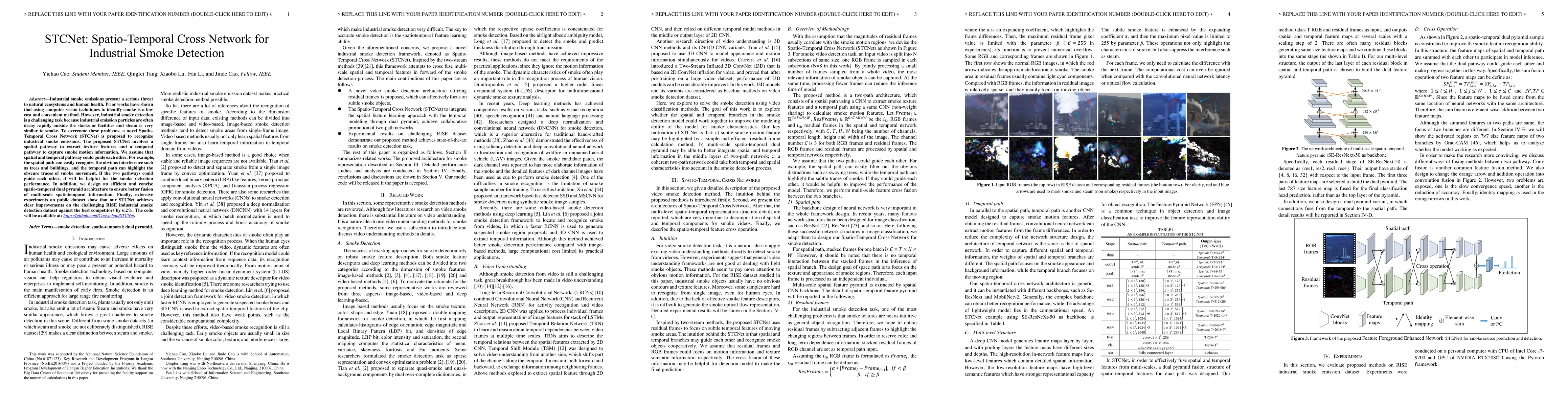 STCNet proposes a novel Spatio-Temporal Cross Network for industrial smoke detection, combining spatial and temporal pathways to extract texture and motion features, respectively, and achieving a 6.2% improvement over competitors on the RISE dataset. The dual pyramid architecture enhances multi-scale spatiotemporal information fusion.