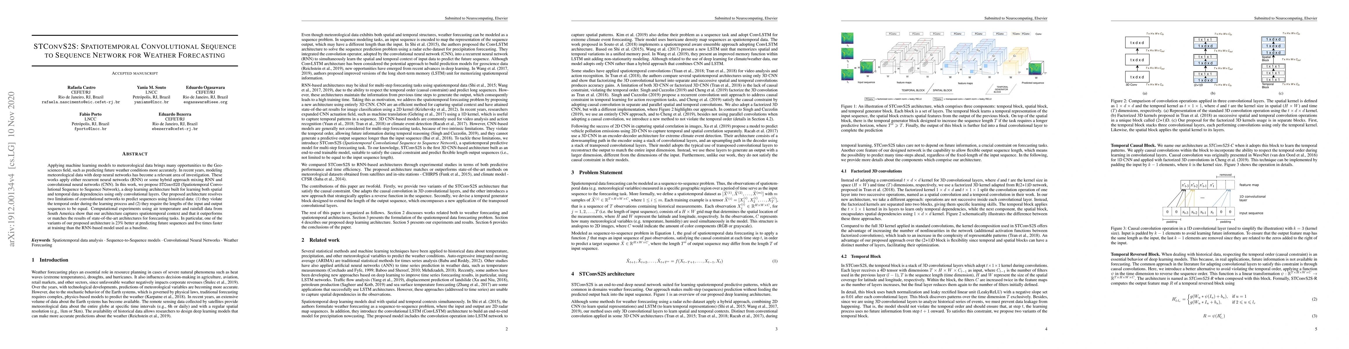 The paper introduces STConvS2S, a convolutional sequence-to-sequence network for weather forecasting that leverages convolutional layers to model spatial and temporal dependencies without violating temporal order. Experiments demonstrate its superior performance and faster training compared to RNN-based models.