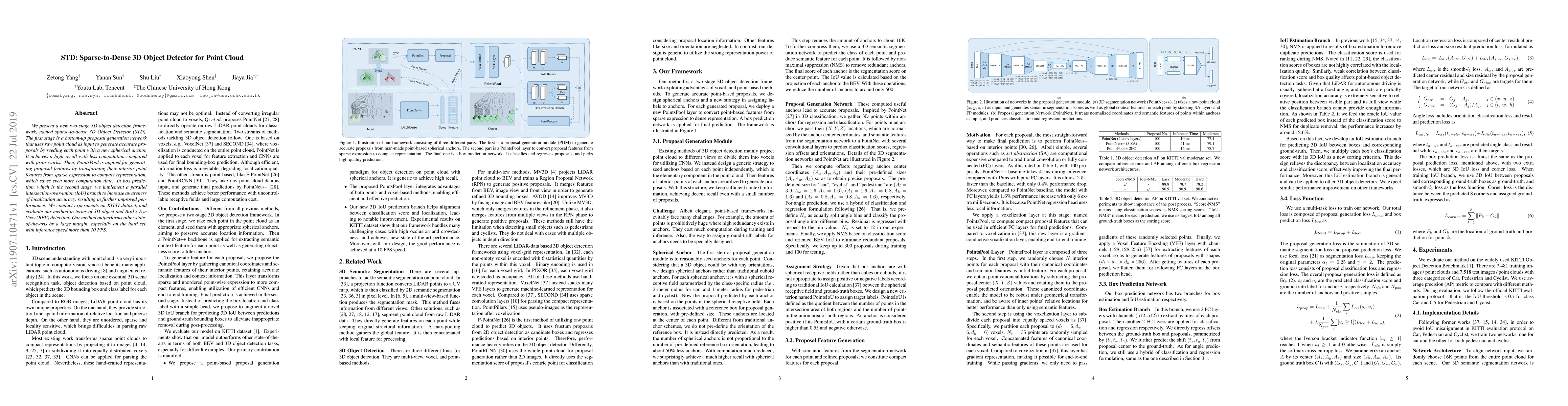 We present a new two-stage 3D object detection framework, named sparse-to-dense 3D Object Detector (STD). The first stage is a bottom-up proposal generation network that uses raw point cloud as input to generate accurate proposals by seeding each point with a new spherical anchor. It achieves a high recall with less computation compared with prior works. Then, PointsPool is applied for generating proposal features by transforming their interior point features from sparse expression to compact representation, which saves even more computation time. In box prediction, which is the second stage, we implement a parallel intersection-over-union (IoU) branch to increase awareness of localization accuracy, resulting in further improved performance. We conduct experiments on KITTI dataset, and evaluate our method in terms of 3D object and Bird's Eye View (BEV) detection. Our method outperforms other state-of-the-arts by a large margin, especially on the hard set, with inference speed more than 10 FPS.