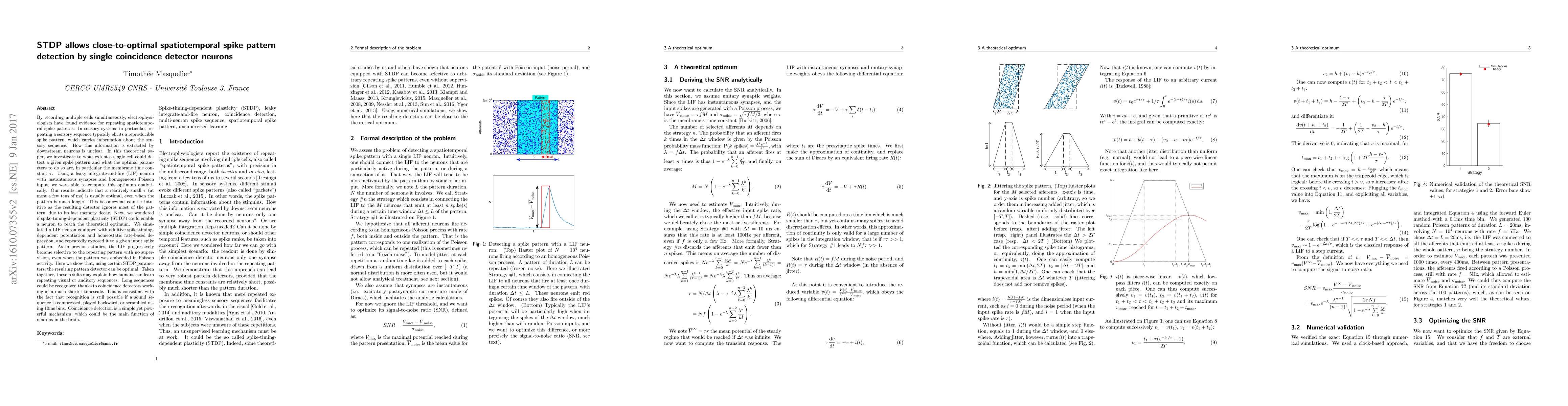 By recording multiple cells simultaneously, electrophysiologists have found evidence for repeating spatiotemporal spike patterns, which can carry information. How this information is extracted by downstream neurons is unclear. In this theoretical paper, we investigate to what extent a single cell could detect a given spike pattern and what the optimal parameters to do so are, in particular the membrane time constant $\tau$. Using a leaky integrate-and-fire (LIF) neuron with instantaneous synapses and homogeneous Poisson input, we were able to compute this optimum analytically. Our results indicate that a relatively small $\tau$ (at most a few tens of ms) is usually optimal, even when the pattern is much longer. This is somewhat counter intuitive as the resulting detector ignores most of the pattern, due to its fast memory decay. Next, we wondered if spike-timing-dependent plasticity (STDP) could enable a neuron to reach the theoretical optimum. We simulated a LIF neuron equipped with additive spike-timing-dependent potentiation and homeostatic rate-based depression, and repeatedly exposed it to a given input spike pattern. As in previous studies, the LIF progressively became selective to the repeating pattern with no supervision, even when the pattern was embedded in Poisson activity. Here we show that, using certain STDP parameters, the resulting pattern detector can be optimal. Taken together, these results may explain how humans can learn repeating visual or auditory sequences. Long sequences could be recognized thanks to coincidence detectors working at a much shorter timescale. This is consistent with the fact that recognition is still possible if a sound sequence is compressed, played backward, or scrambled using 10ms bins. Coincidence detection is a simple yet powerful mechanism, which could be the main function of neurons in the brain.