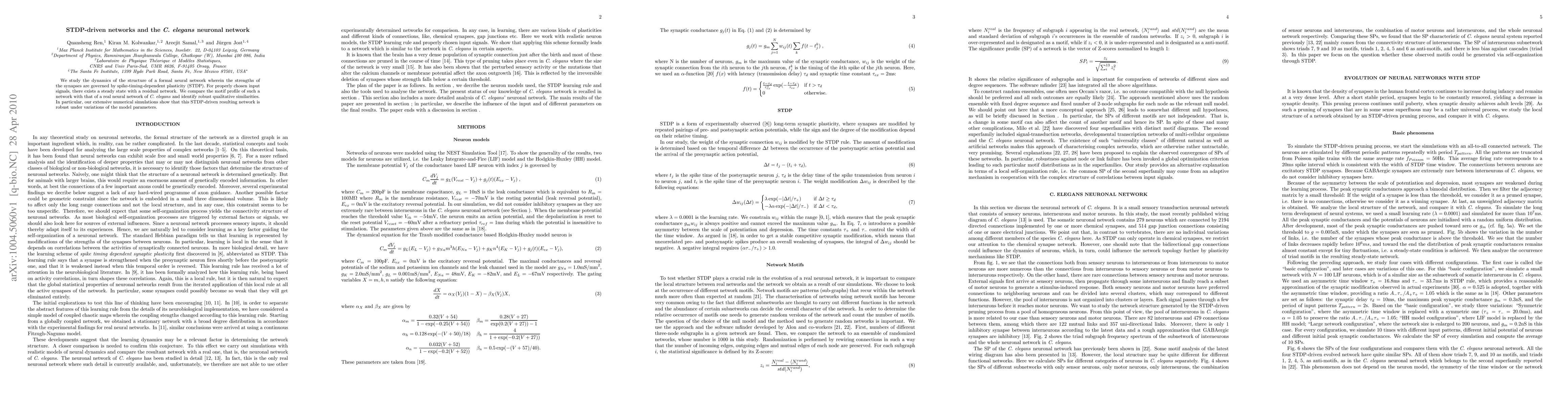 We study the dynamics of the structure of a formal neural network wherein the strengths of the synapses are governed by spike-timing-dependent plasticity (STDP). For properly chosen input signals, there exists a steady state with a residual network. We compare the motif profile of such a network with that of a real neural network of \emph{C. elegans} and identify robust qualitative similarities. In particular, our extensive numerical simulations show that this STDP-driven resulting network is robust under variations of the model parameters.