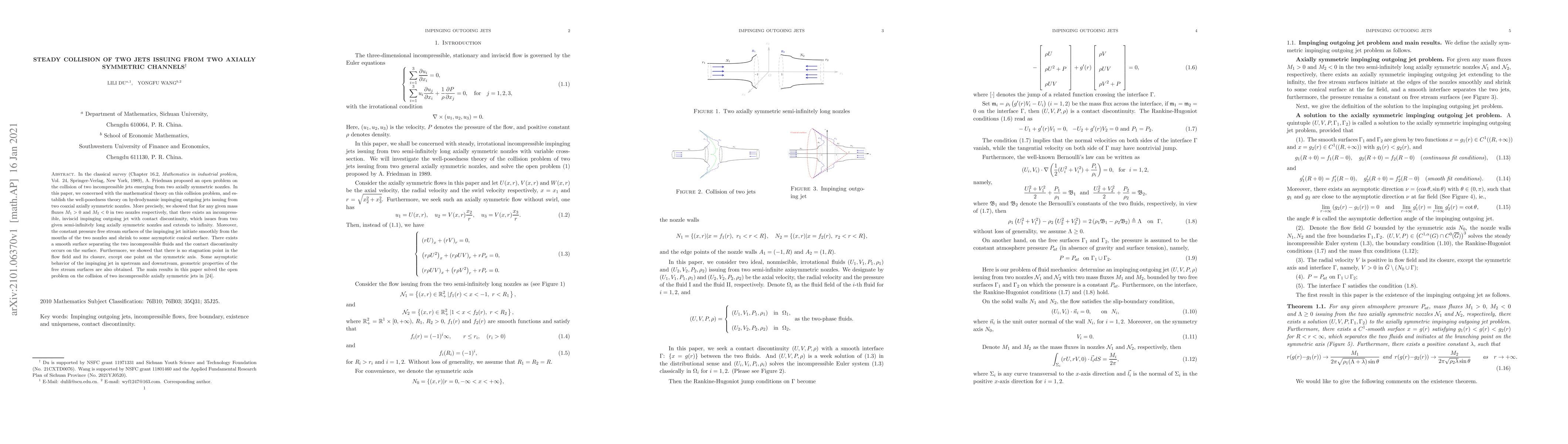 This paper addresses the mathematical theory of the collision of two incompressible jets emanating from coaxial, axially symmetric nozzles, establishing the well-posedness of the problem. It demonstrates the existence of an incompressible, inviscid jet with a contact discontinuity, and proves the absence of a stagnation point in the flow field, except at the symmetric axis.