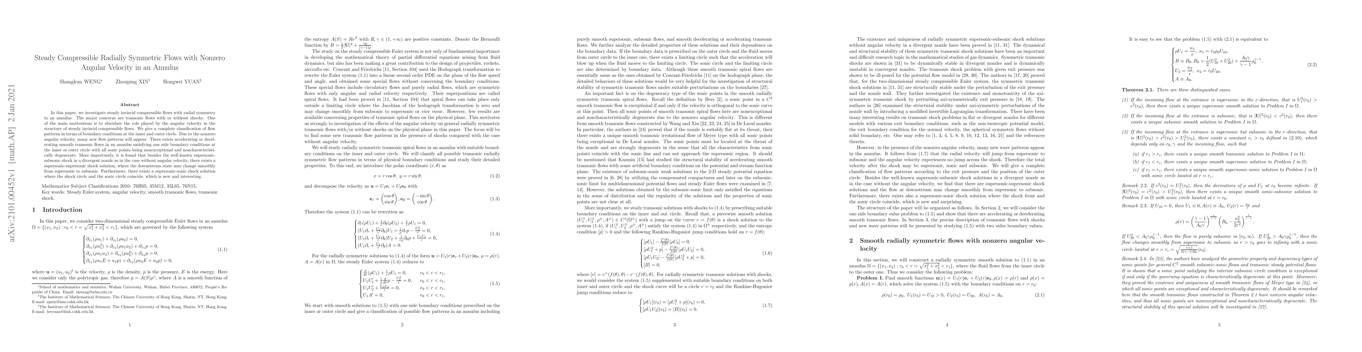 This paper classifies steady inviscid compressible radially symmetric flows in an annulus, focusing on transonic flows with or without shocks, and explores the impact of nonzero angular velocity. It reveals new flow patterns, including supersonic-supersonic and supersonic-sonic shock solutions, alongside smooth transonic flows.