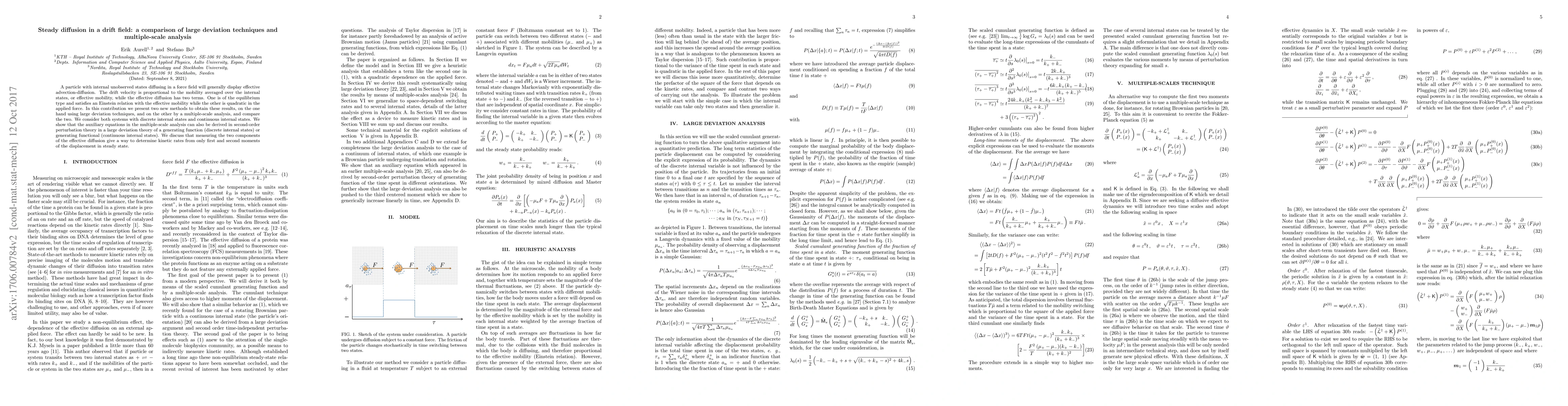 A particle with internal unobserved states diffusing in a force field will generally display effective advection-diffusion. The drift velocity is proportional to the mobility averaged over the internal states, or effective mobility, while the effective diffusion has two terms. One is of the equilibrium type and satisfies an Einstein relation with the effective mobility while the other is quadratic in the applied force. In this contribution we present two new methods to obtain these results, on the one hand using large deviation techniques, and on the other by a multiple-scale analysis, and compare the two. We consider both systems with discrete internal states and continuous internal states. We show that the auxiliary equations in the multiple-scale analysis can also be derived in second-order perturbation theory in a large deviation theory of a generating function (discrete internal states) or generating functional (continuous internal states). We discuss that measuring the two components of the effective diffusion give a way to determine kinetic rates from only first and second moments of the displacement in steady state.