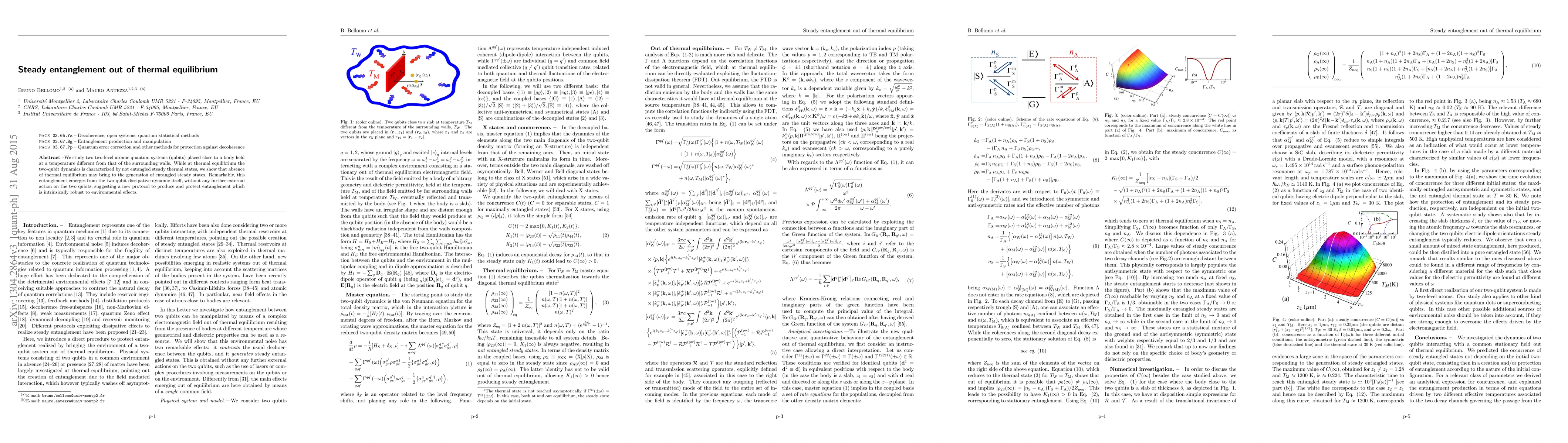 This paper investigates how two qubits placed near a body at a different temperature than surrounding walls can generate entangled steady states through their dissipative dynamics, even when not in thermal equilibrium, offering a robust protocol for entanglement production independent of external actions.
