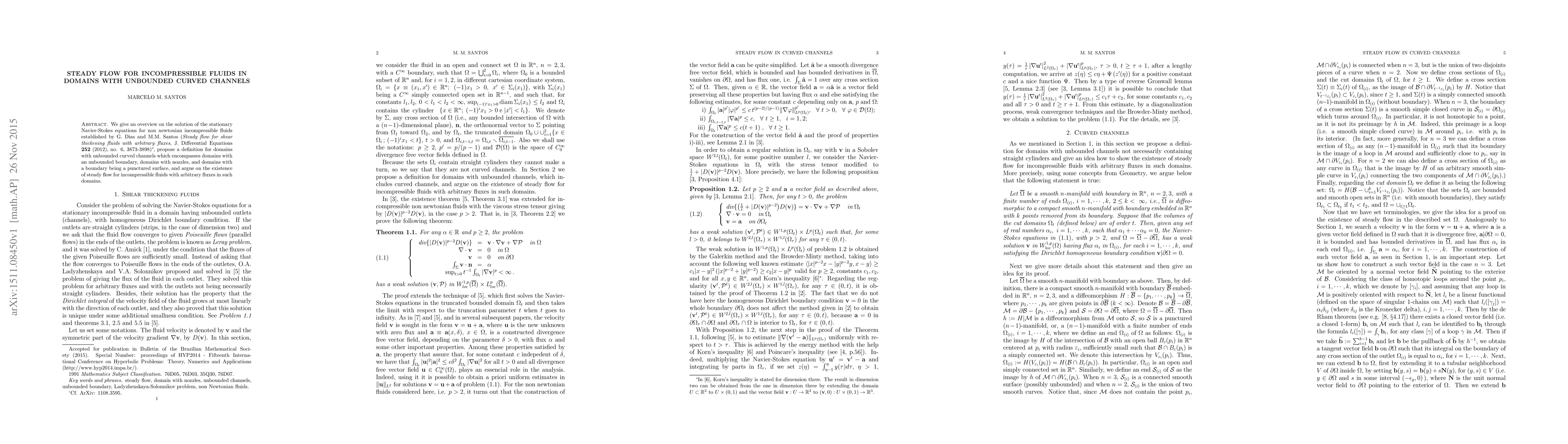 This paper provides an overview of the steady flow solutions for non-Newtonian incompressible fluids in domains with unbounded curved channels, proposing a new definition for such domains and arguing for the existence of steady flow under arbitrary fluxes. The foundational work by G. Dias and M.M. Santos is referenced for its detailed analysis of shear thickening fluids.