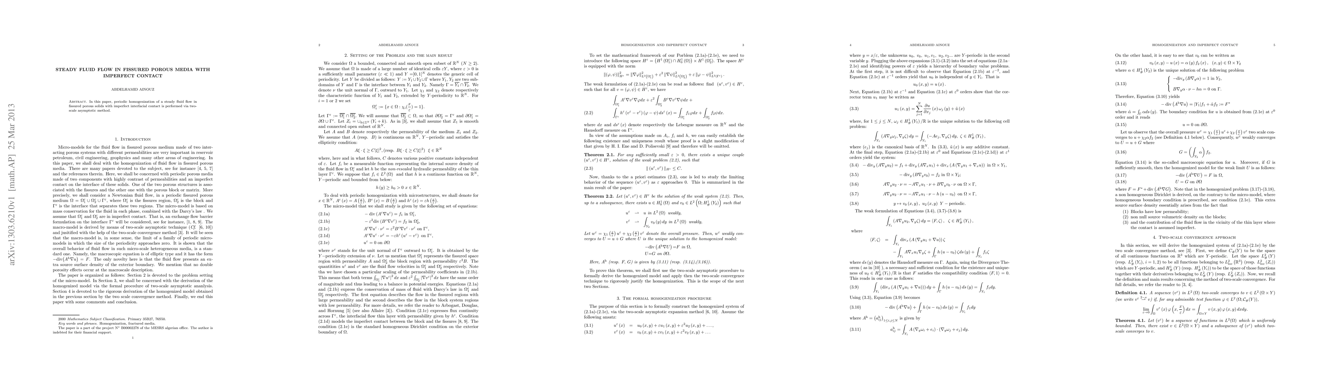 Researchers used a two-scale asymptotic method to study steady fluid flow in porous media with imperfect contact between fissures, finding that the flow can be accurately modeled using periodic homogenization.