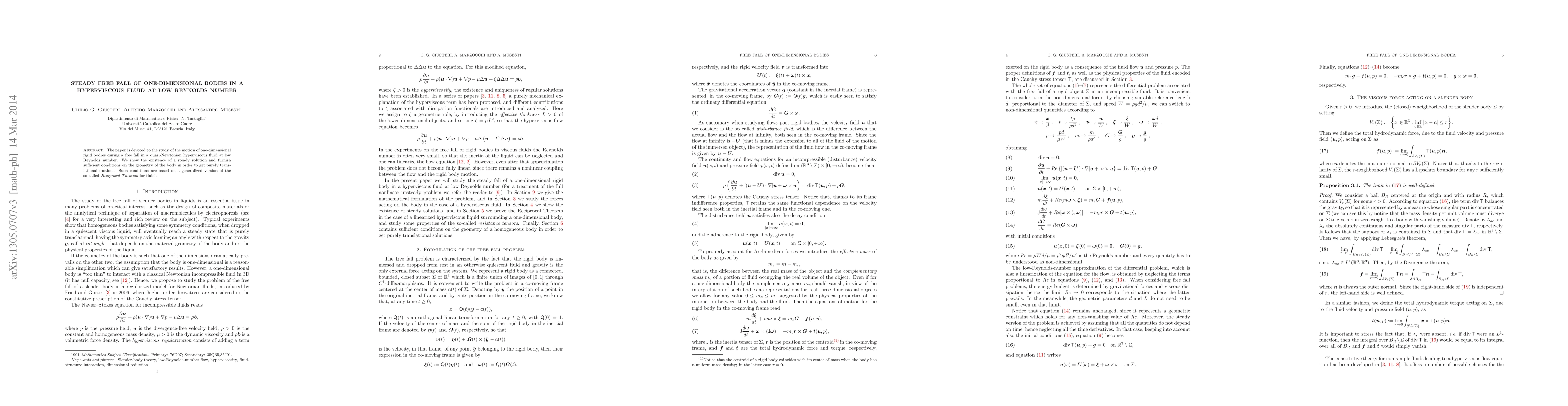 This paper investigates the steady free fall of one-dimensional rigid bodies in a hyperviscous fluid at low Reynolds number, demonstrating the existence of a steady solution and providing conditions for purely translational motion based on a generalized Reciprocal Theorem.