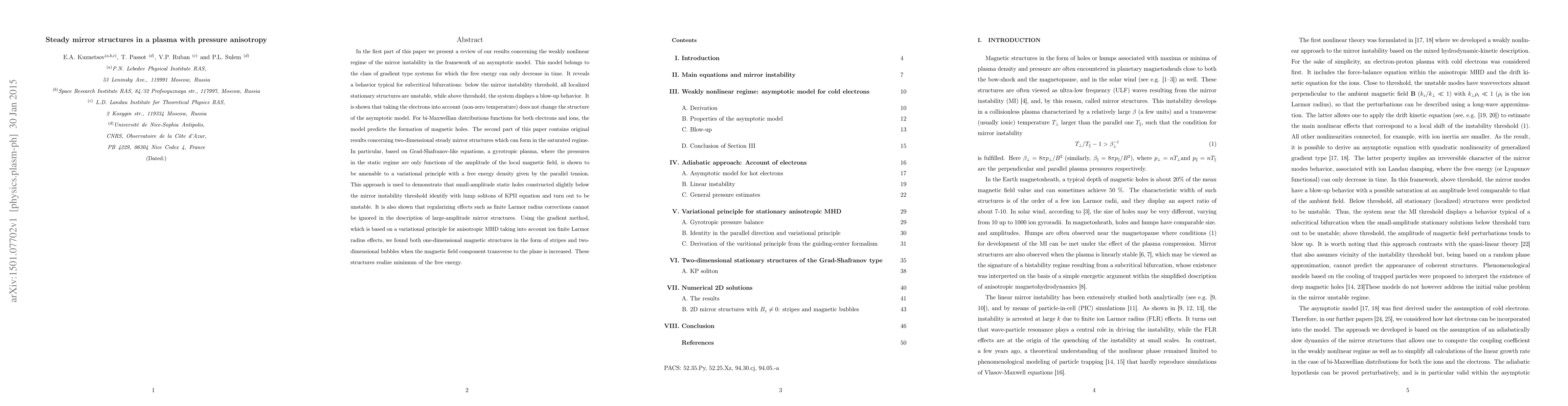 In the first part we present a review of our results concerning the weakly nonlinear regime of the mirror instability in the framework of an asymptotic model. This model belongs to the class of gradient type systems for which the free energy can only decrease in time. It reveals a behavior typical for subcritical bifurcations: below the mirror instability threshold, all localized stationary structures are unstable, while above threshold, the system displays a blow-up behavior. It is shown that taking the electrons into account (non-zero temperature) does not change the structure of the asymptotic model. For bi-Maxwellian distribution functions for both electrons and ions, the model predicts the formation of magnetic holes. The second part contains original results concerning two-dimensional steady mirror structures which can form in the saturated regime. Based on Grad-Shafranov-like equations, a gyrotropic plasma, where the pressures in the static regime are only functions of the amplitude of the local magnetic field, is shown to be amenable to a variational principle with a free energy density given by the parallel tension. This approach is used to demonstrate that small-amplitude static holes constructed slightly below the mirror instability threshold identify with lump solitons of KPII equation and turn out to be unstable. It is also shown that regularizing effects such as finite Larmor radius corrections cannot be ignored in the description of large-amplitude mirror structures. Using the gradient method, which is based on a variational principle for anisotropic MHD taking into account ion finite Larmor radius effects, we found both one-dimensional magnetic structures in the form of stripes and two-dimensional bubbles when the magnetic field component transverse to the plane is increased. These structures realize minimum of the free energy.