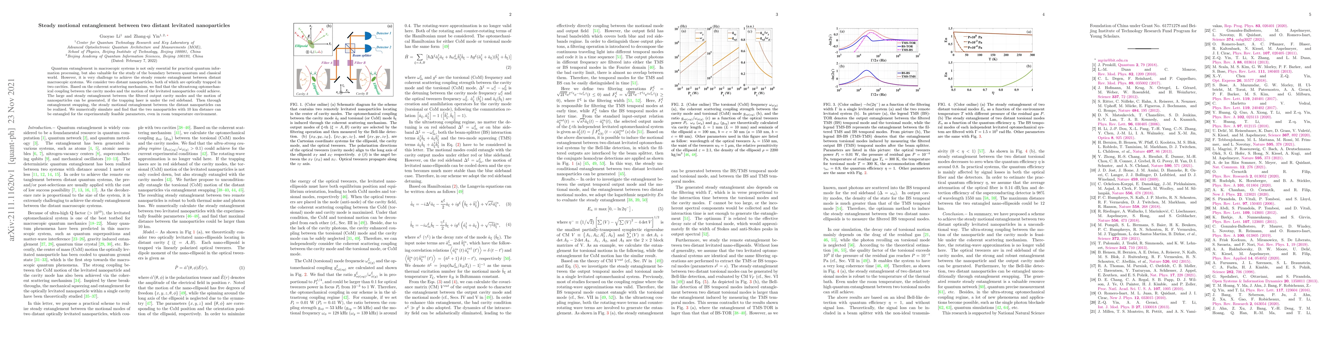 This paper demonstrates the generation of steady motional entanglement between two distant levitated nanoparticles using ultrastrong optomechanical coupling and coherent scattering mechanisms. The study shows that entanglement can be maintained over 10 km even at room temperature, highlighting the feasibility of remote quantum entanglement in macroscopic systems.