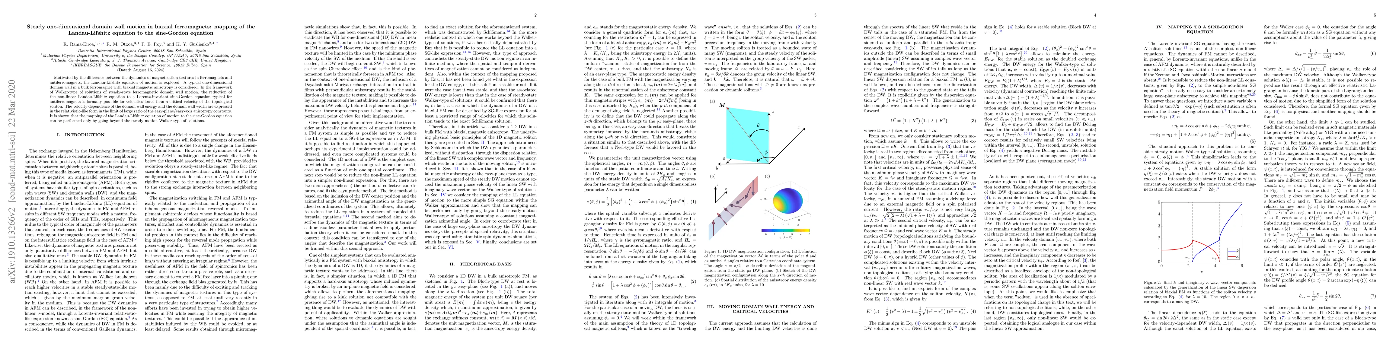 This paper investigates the dynamics of steady one-dimensional domain walls in biaxial ferromagnets by mapping the Landau-Lifshitz equation to the sine-Gordon equation, showing that this reduction is possible at velocities below a critical soliton velocity and only beyond steady-motion Walker-type solutions.