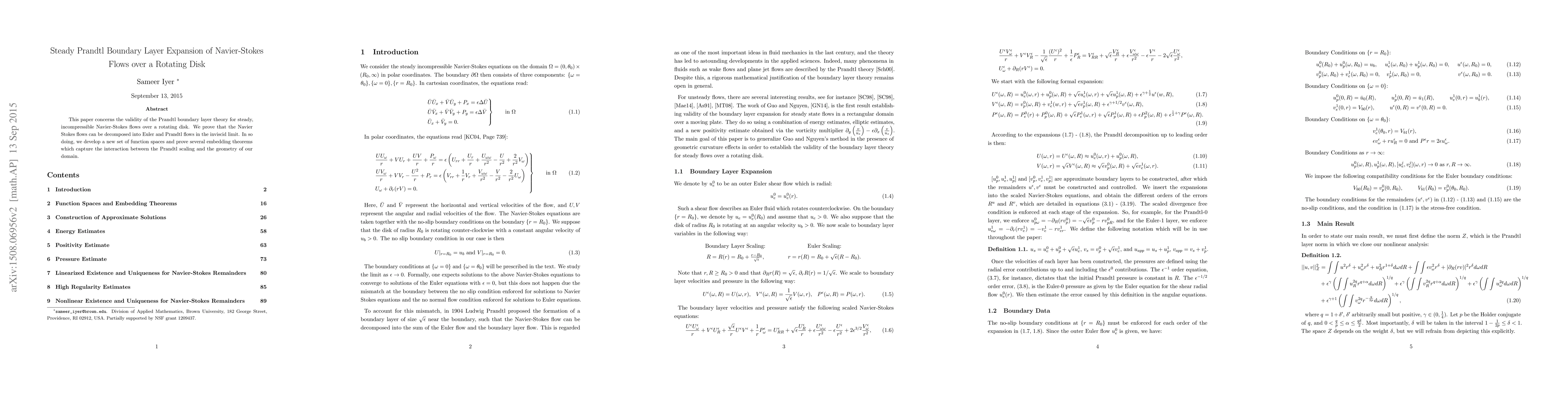 This paper concerns the validity of the Prandtl boundary layer theory for steady, incompressible Navier-Stokes flows over a rotating disk. We prove that the Navier Stokes flows can be decomposed into Euler and Prandtl flows in the inviscid limit. In so doing, we develop a new set of function spaces and prove several embedding theorems which capture the interaction between the Prandtl scaling and the geometry of our domain.
