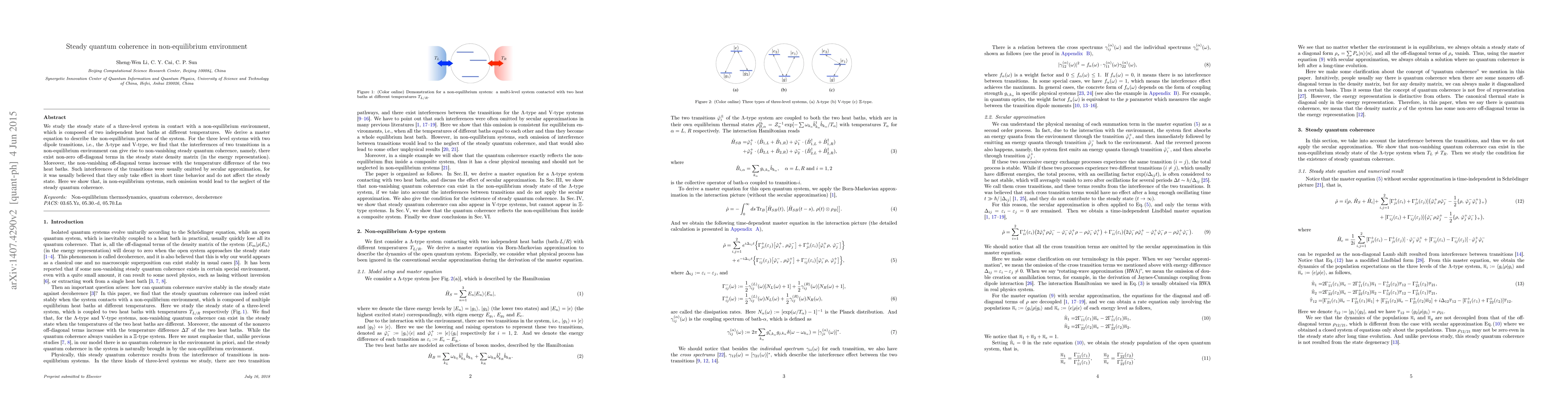 This paper investigates the steady state of a three-level quantum system in contact with two non-equilibrium heat baths, deriving a master equation to describe the process. It reveals that interferences between two transitions in such environments can lead to non-vanishing steady quantum coherence, contrary to the usual secular approximation.