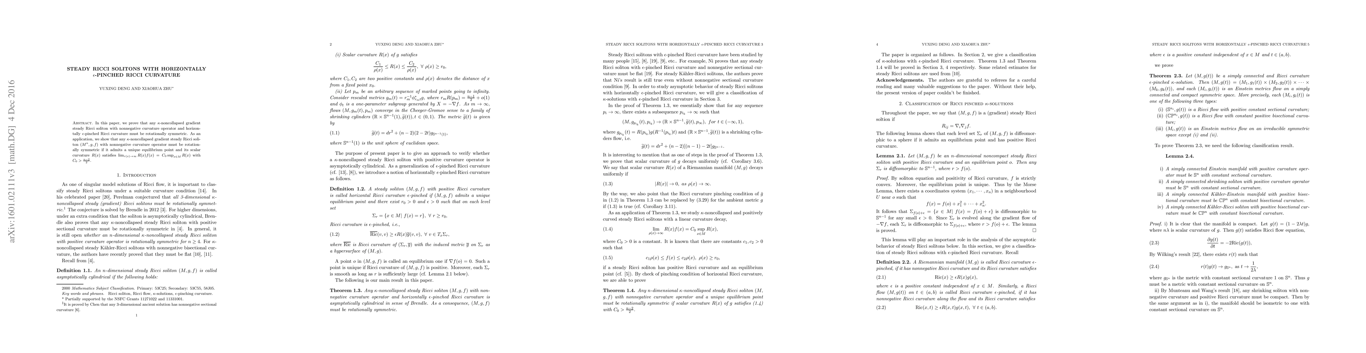 In this paper, we prove that any $\kappa$-noncollapsed gradient steady Ricci soliton with nonnegative curvature operator and horizontally $\epsilon$-pinched Ricci curvature must be rotationally symmetric. As an application, we show that any $\kappa$-noncollapsed gradient steady Ricci soliton $(M^n, g,f)$ with nonnegative curvature operator must be rotationally symmetric if it admits a unique equilibrium point and its scalar curvature $R(x)$ satisfies $\lim_{r(x)\rightarrow\infty}R(x)f(x)=C_0\sup_{x\in M}R(x)$ with $C_0>\frac{n-2}{2}$.