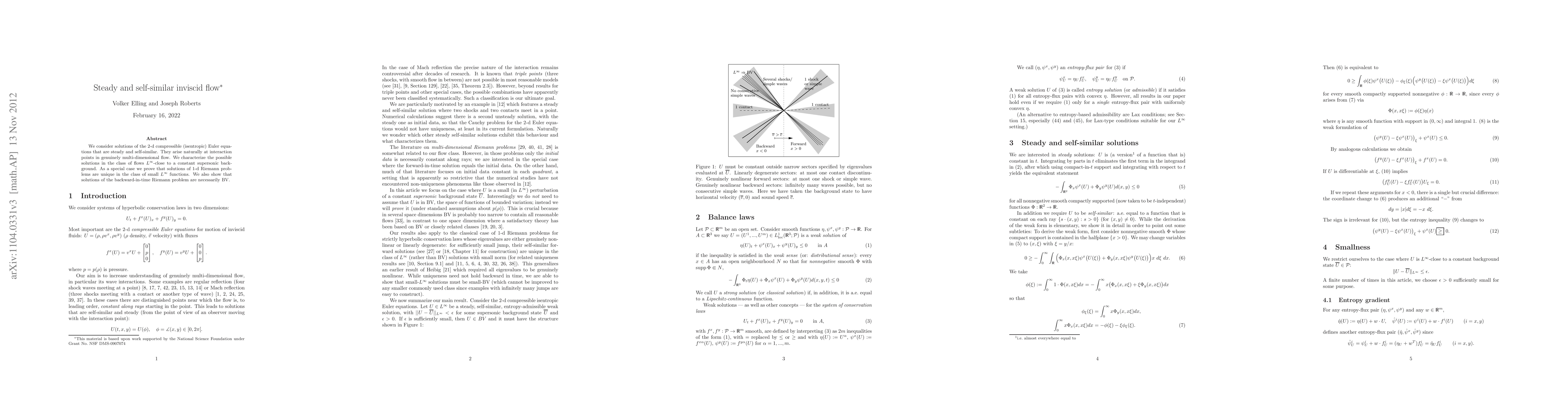 The paper examines steady and self-similar solutions of the 2-dimensional compressible Euler equations, relevant at multi-dimensional flow interaction points. It characterizes solutions close to a constant supersonic background, proving uniqueness for 1-D Riemann problem solutions and showing that backward-in-time Riemann problem solutions are of Bounded Variation.
