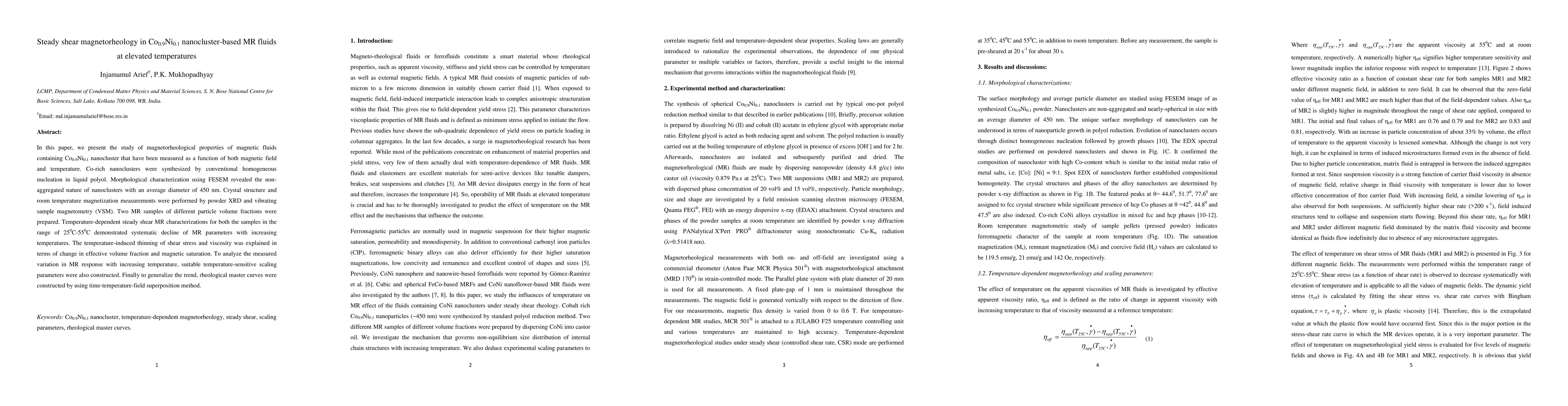This paper investigates the magnetorheological properties of Co0.9Ni0.1 nanocluster-based magnetic fluids at elevated temperatures, showing a systematic decline in MR parameters with increasing temperature due to changes in effective volume fraction and magnetic saturation. Rheological master curves were constructed to generalize the temperature-dependent trends.