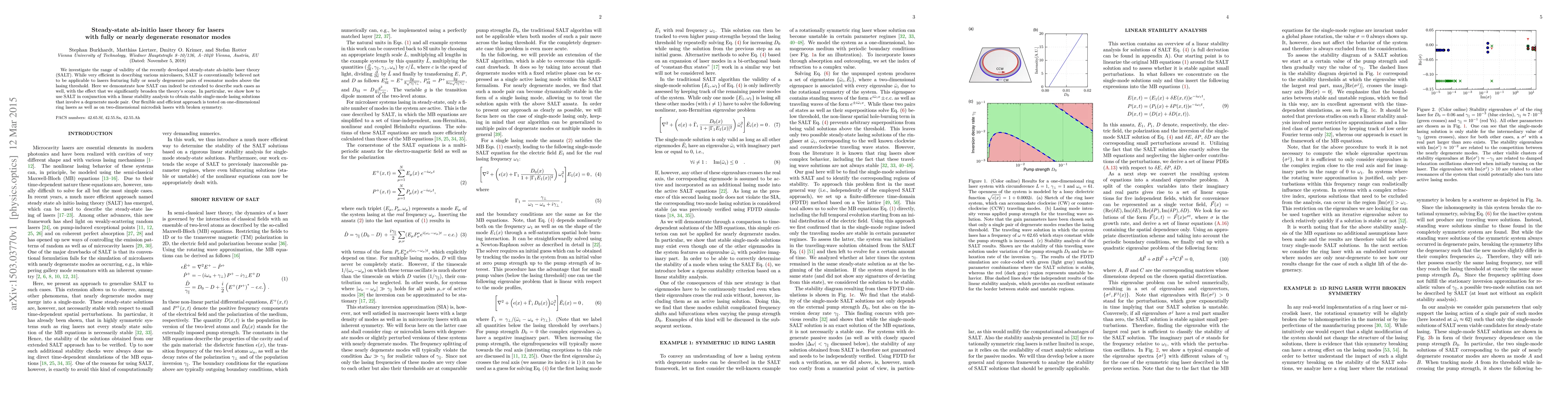 We investigate the range of validity of the recently developed steady-state ab-initio laser theory (SALT). While very efficient in describing various microlasers, SALT is conventionally believed not to be applicable to lasers featuring fully or nearly degenerate pairs of resonator modes above the lasing threshold. Here we demonstrate how SALT can indeed be extended to describe such cases as well, with the effect that we significantly broaden the theory's scope. In particular, we show how to use SALT in conjunction with a linear stability analysis to obtain stable single-mode lasing solutions that involve a degenerate mode pair. Our flexible and efficient approach is tested on one-dimensional ring lasers as well as on two-dimensional microdisk lasers with broken symmetry.
