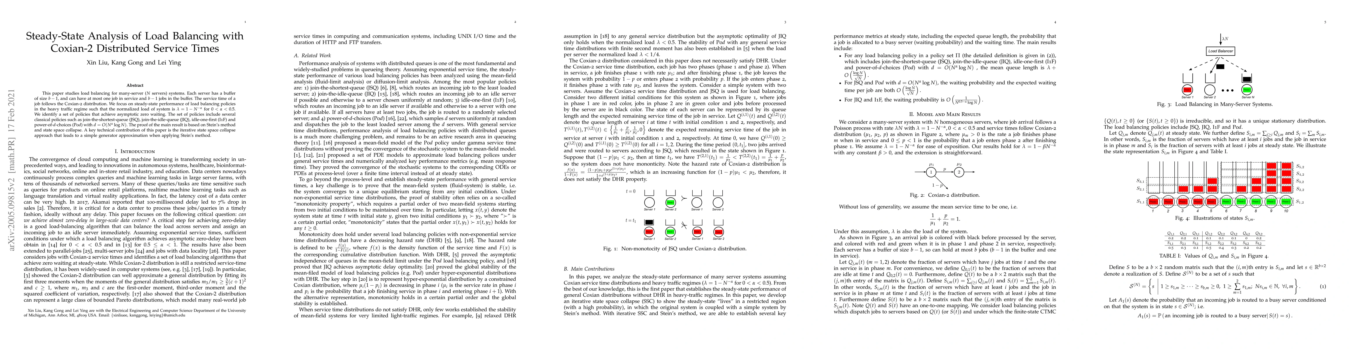 This paper studies load balancing for many-server ($N$ servers) systems. Each server has a buffer of size $b-1,$ and can have at most one job in service and $b-1$ jobs in the buffer. The service time of a job follows the Coxian-2 distribution. We focus on steady-state performance of load balancing policies in the heavy traffic regime such that the normalized load of system is $\lambda = 1 - N^{-\alpha}$ for $0<\alpha<0.5.$ We identify a set of policies that achieve asymptotic zero waiting. The set of policies include several classical policies such as join-the-shortest-queue (JSQ), join-the-idle-queue (JIQ), idle-one-first (I1F) and power-of-$d$-choices (Po$d$) with $d=O(N^\alpha\log N)$. The proof of the main result is based on Stein's method and state space collapse. A key technical contribution of this paper is the iterative state space collapse approach that leads to a simple generator approximation when applying Stein's method.