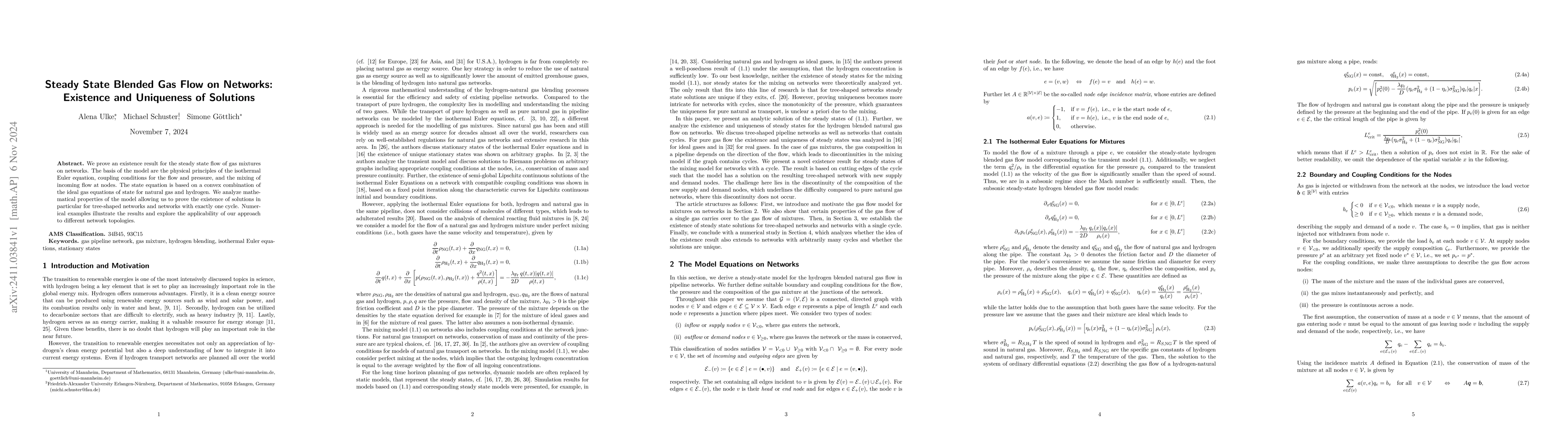 This paper proves the existence of steady state gas mixture flows on network topologies using an isothermal Euler model, focusing on tree-shaped networks and single-cycle networks. The model combines ideal gas laws and demonstrates mathematical properties ensuring unique solutions, supported by numerical examples.