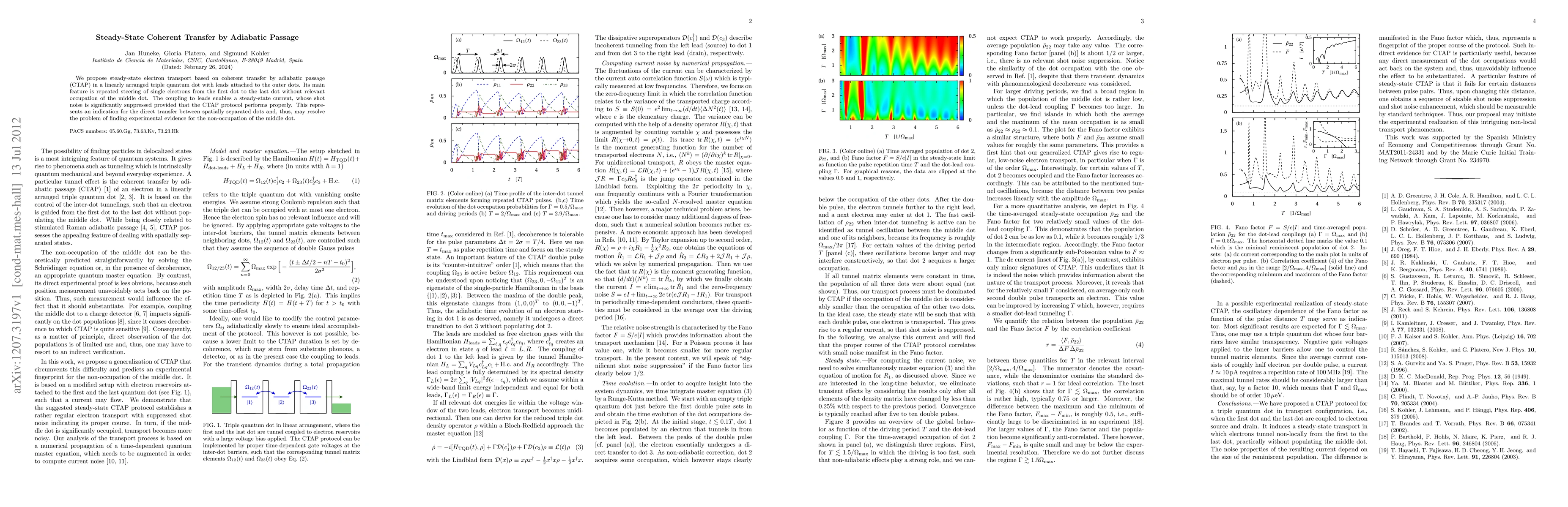 We propose steady-state electron transport based on coherent transfer by adiabatic passage (CTAP) in a linearly arranged triple quantum dot with leads attached to the outer dots. Its main feature is repeated steering of single electrons from the first dot to the last dot without relevant occupation of the middle dot. The coupling to leads enables a steady-state current, whose shot noise is significantly suppressed provided that the CTAP protocol performs properly. This represents an indication for the direct transfer between spatially separated dots and, thus, may resolve the problem of finding experimental evidence for the non-occupation of the middle dot.