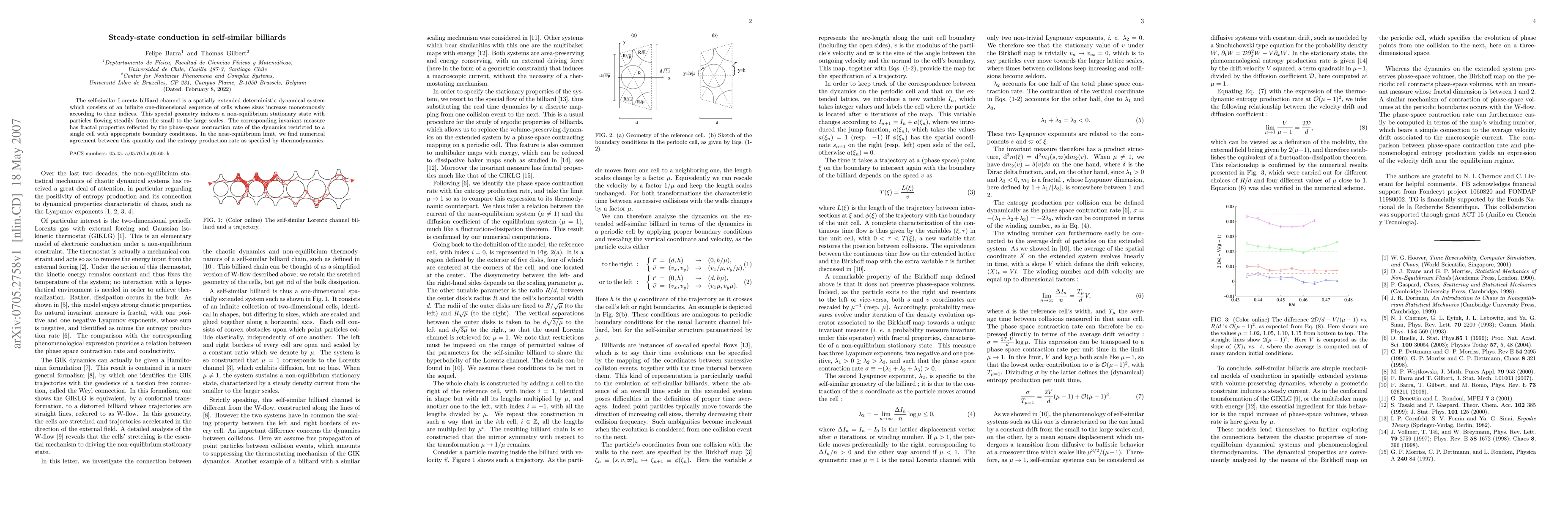 The self-similar Lorentz billiard channel is a spatially extended deterministic dynamical system which consists of an infinite one-dimensional sequence of cells whose sizes increase monotonically according to their indices. This special geometry induces a nonequilibrium stationary state with particles flowing steadily from the small to the large scales. The corresponding invariant measure has fractal properties reflected by the phase-space contraction rate of the dynamics restricted to a single cell with appropriate boundary conditions. In the near-equilibrium limit, we find numerical agreement between this quantity and the entropy production rate as specified by thermodynamics.