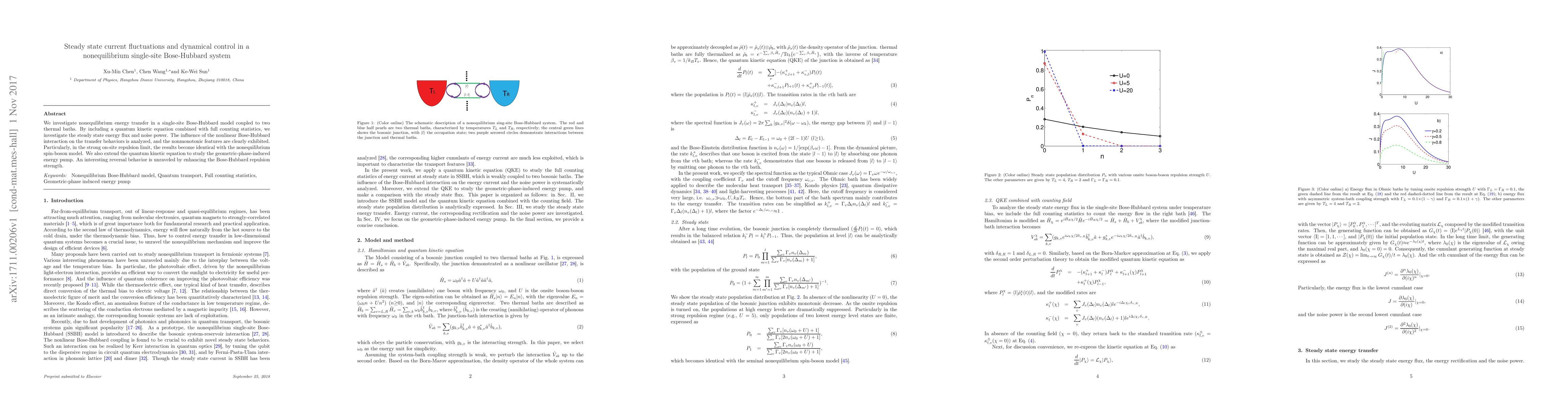 We investigate nonequilibrium energy transfer in a single-site Bose-Hubbard model coupled to two thermal baths. By including a quantum kinetic equation combined with full counting statistics, we investigate the steady state energy flux and noise power. The influence of the nonlinear Bose-Hubbard interaction on the transfer behaviors is analyzed, and the nonmonotonic features are clearly exhibited. Particularly, in the strong on-site repulsion limit, the results become identical with the nonequilibrium spin-boson model. We also extend the quantum kinetic equation to study the geometric-phase-induced energy pump. An interesting reversal behavior is unraveled by enhancing the Bose-Hubbard repulsion strength.