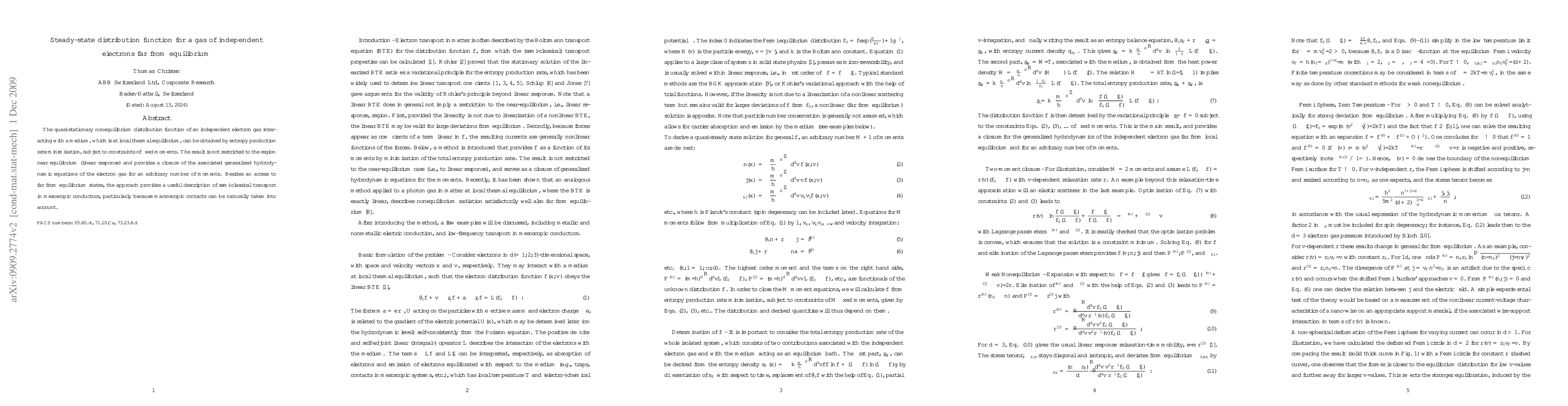 This paper derives a quasi-stationary nonequilibrium distribution function for an independent electron gas interacting with a locally thermal medium, using entropy production rate minimization. The method provides a generalized hydrodynamic description applicable far from equilibrium and useful for mesoscopic conductor transport.