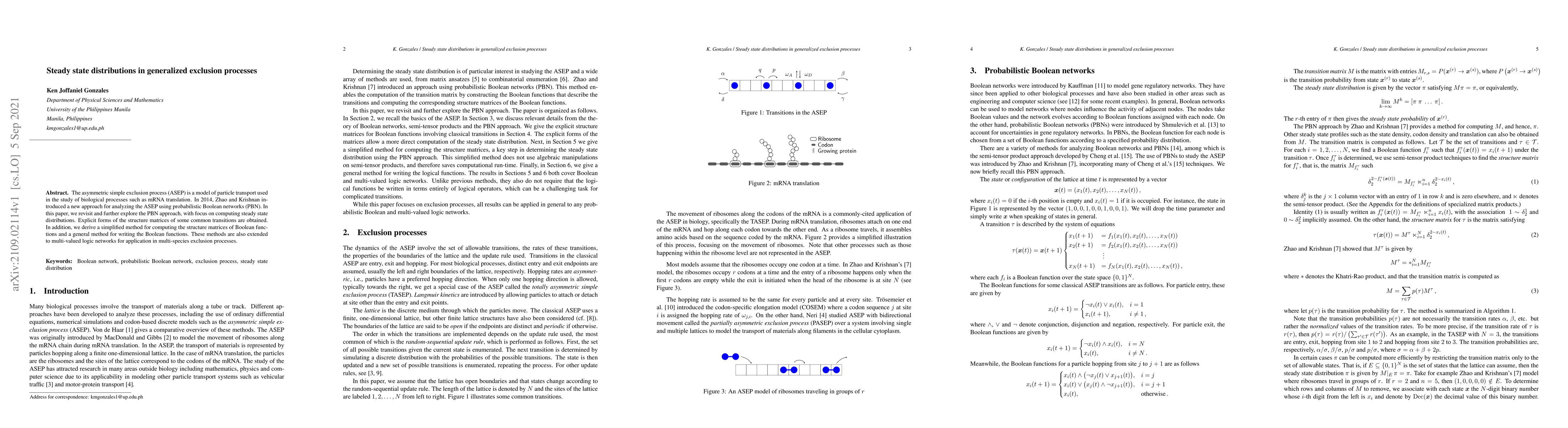 The asymmetric simple exclusion process (ASEP) is a model of particle transport used in the study of biological processes such as mRNA translation. In 2014, Zhao and Krishnan introduced a new approach for analyzing the ASEP using probabilistic Boolean networks (PBN). In this paper, we revisit and further explore the PBN approach, with focus on computing steady state distributions. Explicit forms of the structure matrices of some common transitions are obtained. In addition, we derive a simplified method for computing the structure matrices of Boolean functions and a general method for writing the Boolean functions. These methods are also extended to multi-valued logic networks for application in multi-species exclusion processes.
