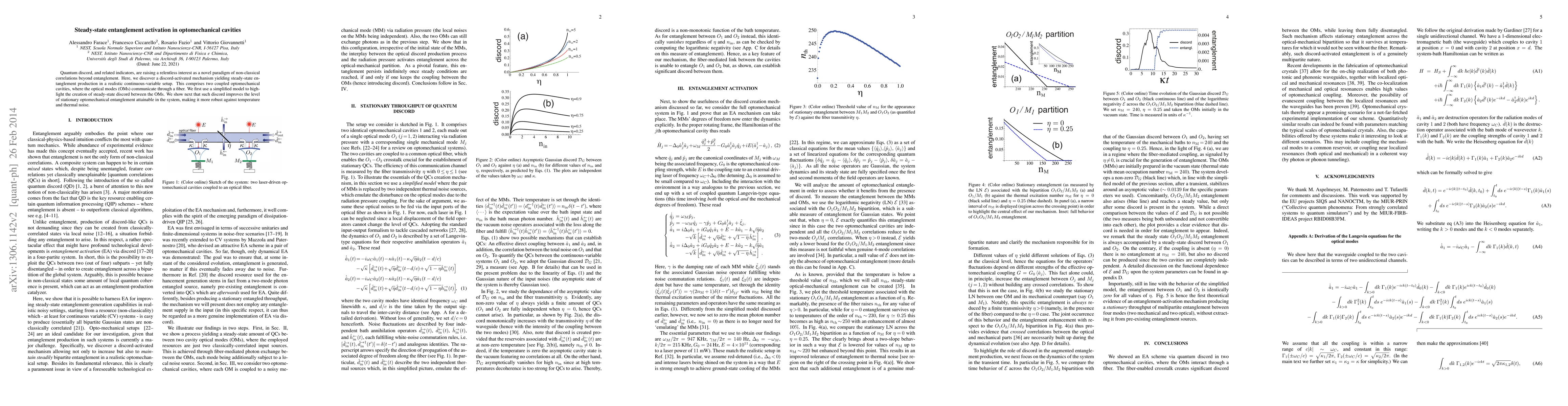 Quantum discord, and a number of related indicators, are currently raising a relentless interest as a novel paradigm of non-classical correlations beyond entanglement. Beside merely fundamental aspects, various works have shown that discord is a valuable -- so far largely unexplored -- resource in quantum information processing. Along this line, quite a striking scheme is {entanglement activation}. An initial amount of discord between two disentangled parties of a multipartite system affects the dynamics so as to establish entanglement across a bipartition, which would not arise otherwise. To date, such a process was proven to be achievable only dynamically, i.e., with no guarantee of a stationary entanglement throughput in the presence of noise. Here, we discover a {\it discord-activated mechanism yielding steady-state entanglement} production in a realistic continuous-variable setup. This comprises two coupled optomechanical cavities, where the optical modes (OMs) communicate through a fiber. We first use a simplified model to highlight the creation of steady-state discord between the OMs. We show next that such discord improves the level of stationary optomechanical entanglement attainable in the system, making it more robust against temperature and thermal noise.