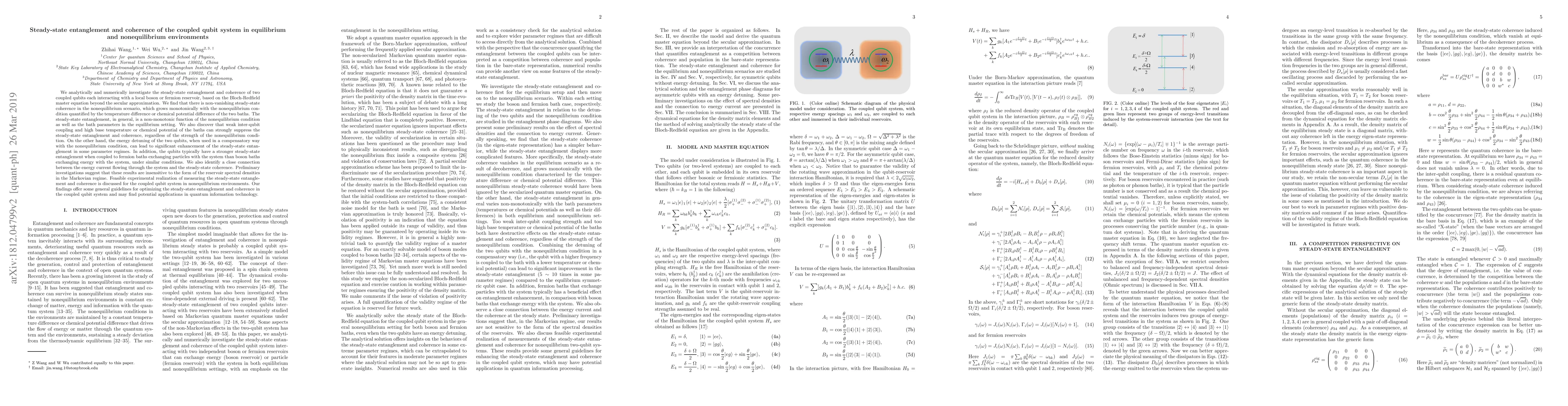 This paper investigates the steady-state entanglement and coherence of coupled qubits interacting with local reservoirs, finding non-vanishing coherence in nonequilibrium scenarios and non-monotonic entanglement behavior. It highlights the role of inter-qubit coupling, bath parameters, and energy detuning in optimizing entanglement and coherence, with potential applications in quantum information technology.