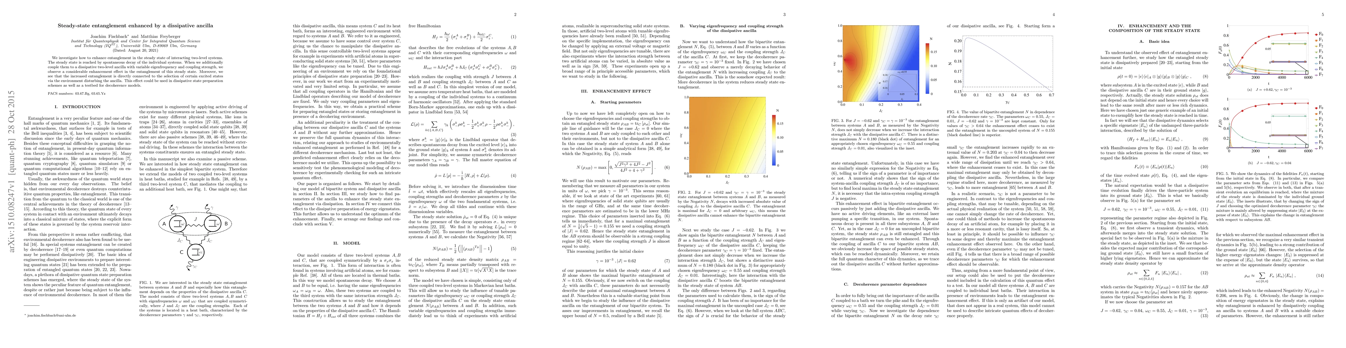This study explores how coupling interacting two-level systems to a dissipative ancilla enhances steady-state entanglement, revealing that the increased entanglement is linked to the selection of specific excited states via environmental disturbance. This effect has potential applications in dissipative state preparation and decoherence model testing.