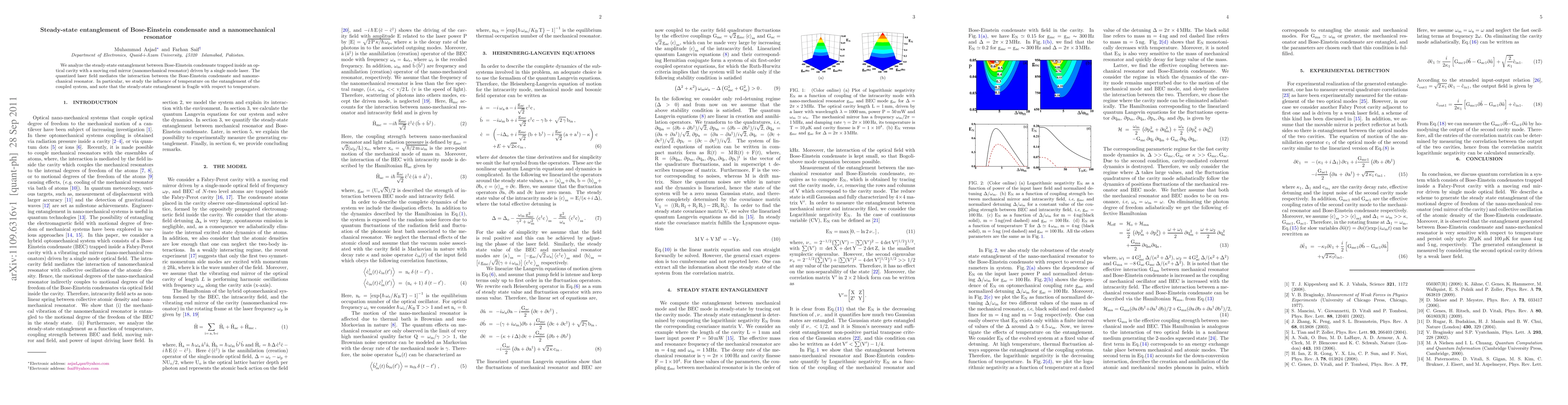 The paper presents a comprehensive theoretical framework for analyzing steady-state entanglement between a BEC and a nanomechanical resonator, including linearized quantum Langevin equations and the computation of logarithmic negativity from the covariance matrix.