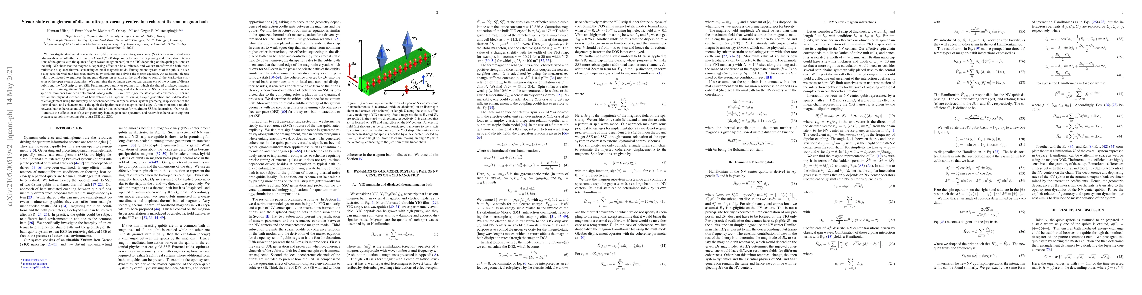 We investigate steady-state entanglement (SSE) between two nitrogen-vacancy (NV) centers in distant nanodiamonds on an ultrathin Yttrium Iron Garnet (YIG) strip. We determine the dephasing and dissipative interactions of the qubits with the quanta of spin waves (magnon bath) in the YIG depending on the qubit positions on the strip. We show that the magnon's dephasing effect can be eliminated, and we can transform the bath into a multimode displaced thermal state using external magnetic fields. Entanglement dynamics of the qubits in such a displaced thermal bath have been analyzed by deriving and solving the master equation. An additional electric field is considered to engineer the magnon dispersion relation at the band edge to control the Markovian character of the open system dynamics. We determine the optimum geometrical parameters of the system of distant qubits and the YIG strip to get SSE. Furthermore, parameter regimes for which the shared displaced magnon bath can sustain significant SSE against the local dephasing and decoherence of NV centers to their nuclear spin environments have been determined. Along with SSE, we investigate the steady-state coherence (SSC) and explain the physical mechanism of how delayed SSE appears following a rapid generation and sudden death of entanglement using the interplay of decoherence-free subspace states, system geometry, displacement of the thermal bath, and enhancement of the qubit dissipation near the magnon band edge. A non-monotonic relation between bath coherence and SSE is found, and critical coherence for maximum SSE is determined. Our results illuminate the efficient use of system geometry, band edge in bath spectrum, and reservoir coherence to engineer system-reservoir interactions for robust SSE and SSC.