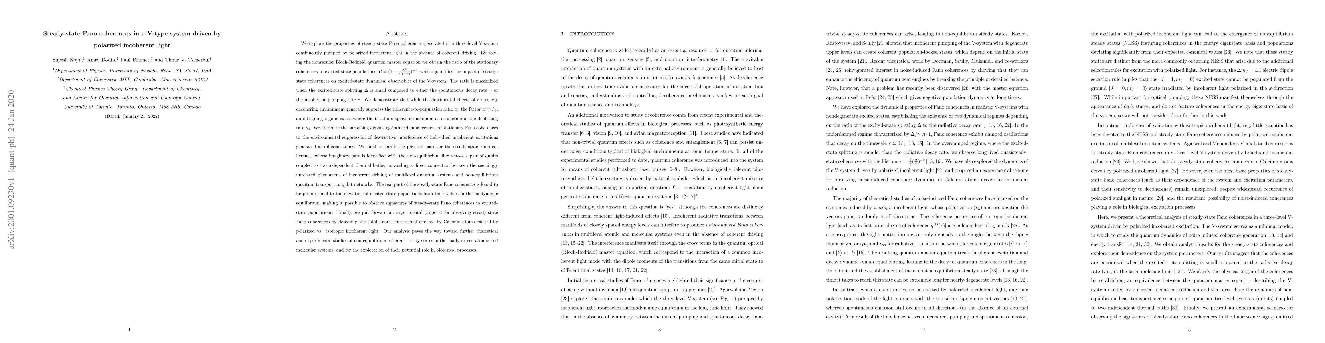 This paper investigates steady-state Fano coherences in a V-type quantum system driven by polarized incoherent light, revealing that coherences are maximized when the excited-state splitting is small relative to decay and pumping rates. The study uncovers a regime where coherences peak with dephasing rate, attributing this to environmental suppression of interference, and connects incoherent excitation to non-equilibrium quantum transport in qubit networks.